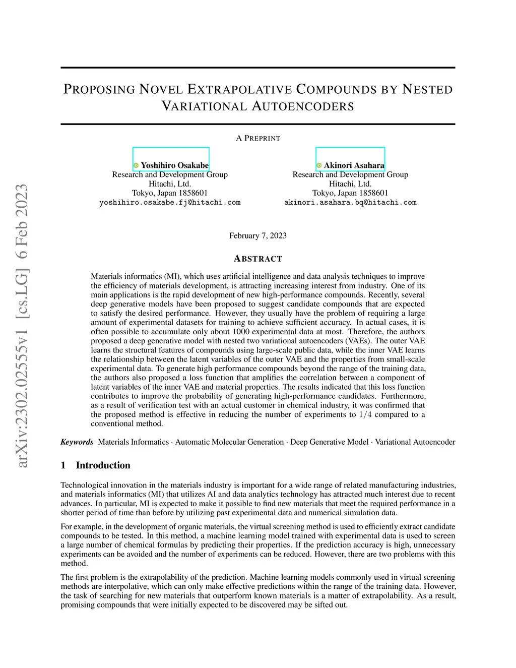 Materials informatics (MI), which uses artificial intelligence and data analysis techniques to improve the efficiency of materials development, is attracting increasing interest from industry. One of its main applications is the rapid development of new high-performance compounds. Recently, several deep generative models have been proposed to suggest candidate compounds that are expected to satisfy the desired performance. However, they usually have the problem of requiring a large amount of experimental datasets for training to achieve sufficient accuracy. In actual cases, it is often possible to accumulate only about 1000 experimental data at most. Therefore, the authors proposed a deep generative model with nested two variational autoencoders (VAEs). The outer VAE learns the structural features of compounds using large-scale public data, while the inner VAE learns the relationship between the latent variables of the outer VAE and the properties from small-scale experimental data. To generate high performance compounds beyond the range of the training data, the authors also proposed a loss function that amplifies the correlation between a component of latent variables of the inner VAE and material properties. The results indicated that this loss function contributes to improve the probability of generating high-performance candidates. Furthermore, as a result of verification test with an actual customer in chemical industry, it was confirmed that the proposed method is effective in reducing the number of experiments to compared to a conventional method.