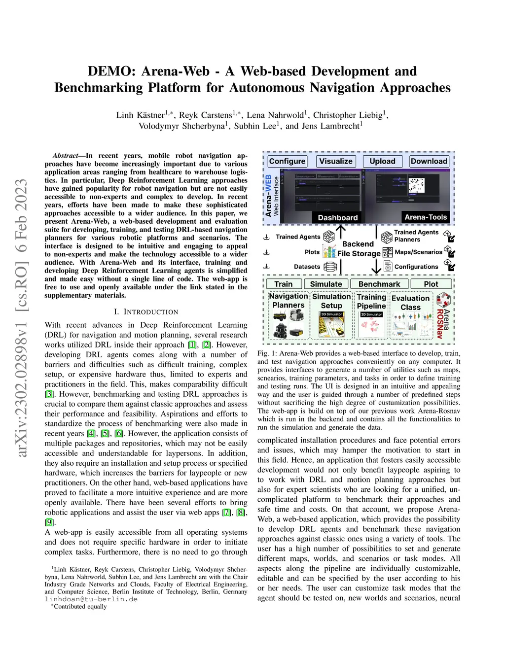 In recent years, mobile robot navigation approaches have become increasingly important due to various application areas ranging from healthcare to warehouse logistics. In particular, Deep Reinforcement Learning approaches have gained popularity for robot navigation but are not easily accessible to non-experts and complex to develop. In recent years, efforts have been made to make these sophisticated approaches accessible to a wider audience. In this paper, we present Arena-Web, a web-based development and evaluation suite for developing, training, and testing DRL-based navigation planners for various robotic platforms and scenarios. The interface is designed to be intuitive and engaging to appeal to non-experts and make the technology accessible to a wider audience. With Arena-Web and its interface, training and developing Deep Reinforcement Learning agents is simplified and made easy without a single line of code. The web-app is free to use and openly available under the link stated in the supplementary materials.