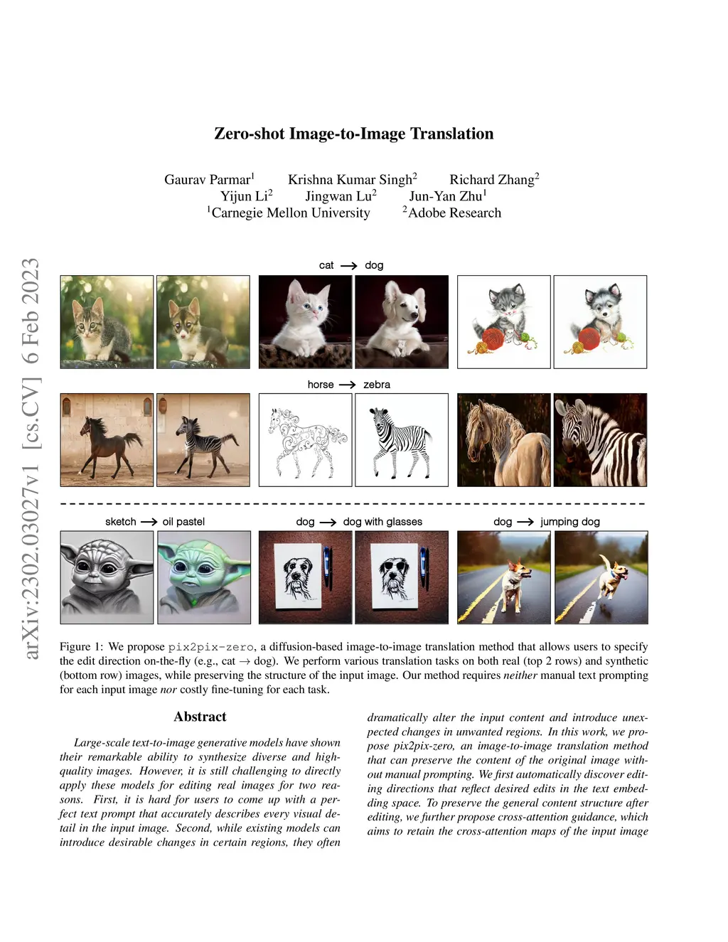 Large-scale text-to-image generative models have shown their remarkable ability to synthesize diverse and high-quality images. However, it is still challenging to directly apply these models for editing real images for two reasons. First, it is hard for users to come up with a perfect text prompt that accurately describes every visual detail in the input image. Second, while existing models can introduce desirable changes in certain regions, they often dramatically alter the input content and introduce unexpected changes in unwanted regions. In this work, we propose pix2pix-zero, an image-to-image translation method that can preserve the content of the original image without manual prompting. We first automatically discover editing directions that reflect desired edits in the text embedding space. To preserve the general content structure after editing, we further propose cross-attention guidance, which aims to retain the cross-attention maps of the input image throughout the diffusion process. In addition, our method does not need additional training for these edits and can directly use the existing pre-trained text-to-image diffusion model. We conduct extensive experiments and show that our method outperforms existing and concurrent works for both real and synthetic image editing.