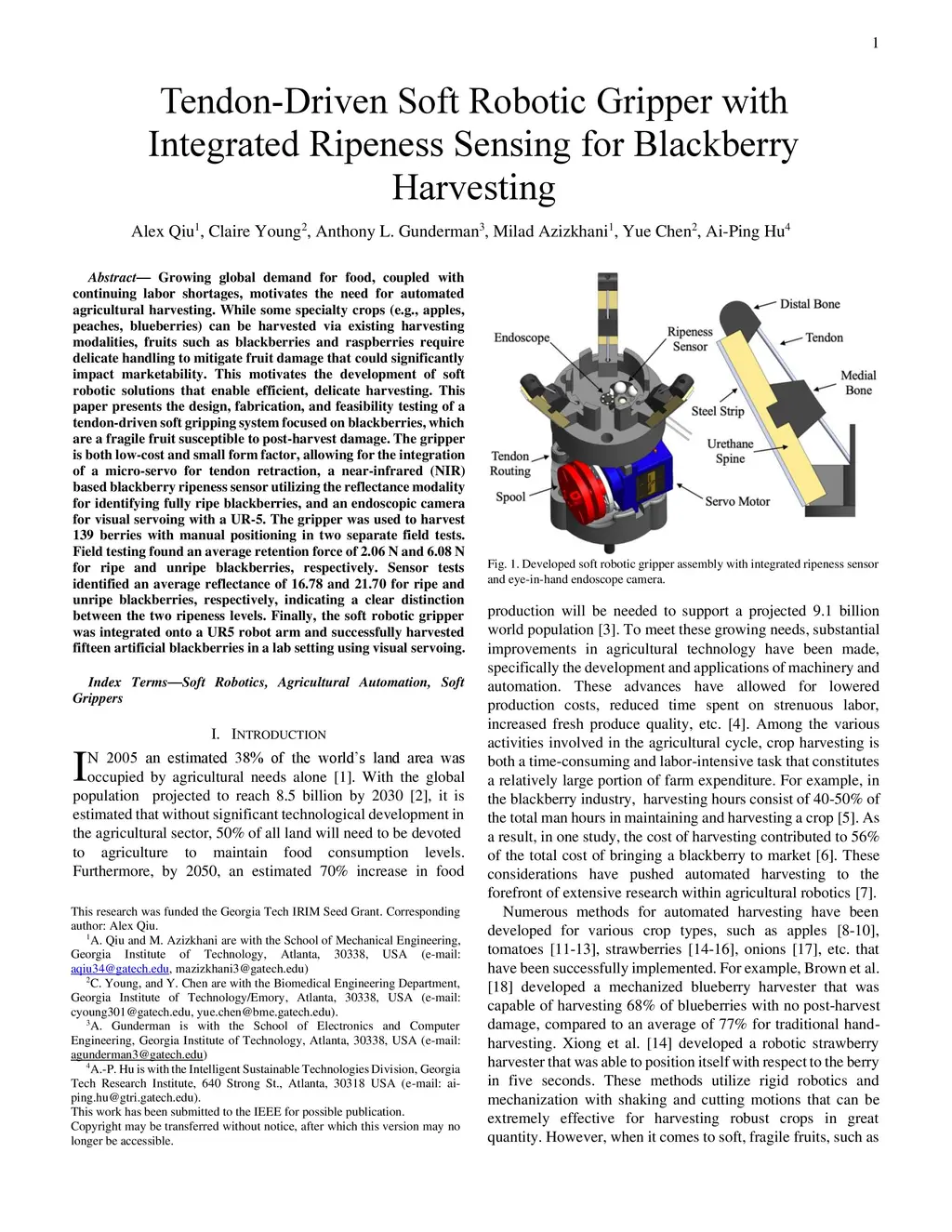 Growing global demand for food, coupled with continuing labor shortages, motivates the need for automated agricultural harvesting. While some specialty crops (e.g., apples, peaches, blueberries) can be harvested via existing harvesting modalities, fruits such as blackberries and raspberries require delicate handling to mitigate fruit damage that could significantly impact marketability. This motivates the development of soft robotic solutions that enable efficient, delicate harvesting. This paper presents the design, fabrication, and feasibility testing of a tendon-driven soft gripping system focused on blackberries, which are a fragile fruit susceptible to post-harvest damage. The gripper is both low-cost and small form factor, allowing for the integration of a micro-servo for tendon retraction, a near-infrared (NIR) based blackberry ripeness sensor utilizing the reflectance modality for identifying fully ripe blackberries, and an endoscopic camera for visual servoing with a UR-5. The gripper was used to harvest 139 berries with manual positioning in two separate field tests. Field testing found an average retention force of 2.06 N and 6.08 N for ripe and unripe blackberries, respectively. Sensor tests identified an average reflectance of 16.78 and 21.70 for ripe and unripe blackberries, respectively, indicating a clear distinction between the two ripeness levels. Finally, the soft robotic gripper was integrated onto a UR5 robot arm and successfully harvested fifteen artificial blackberries in a lab setting using visual servoing.