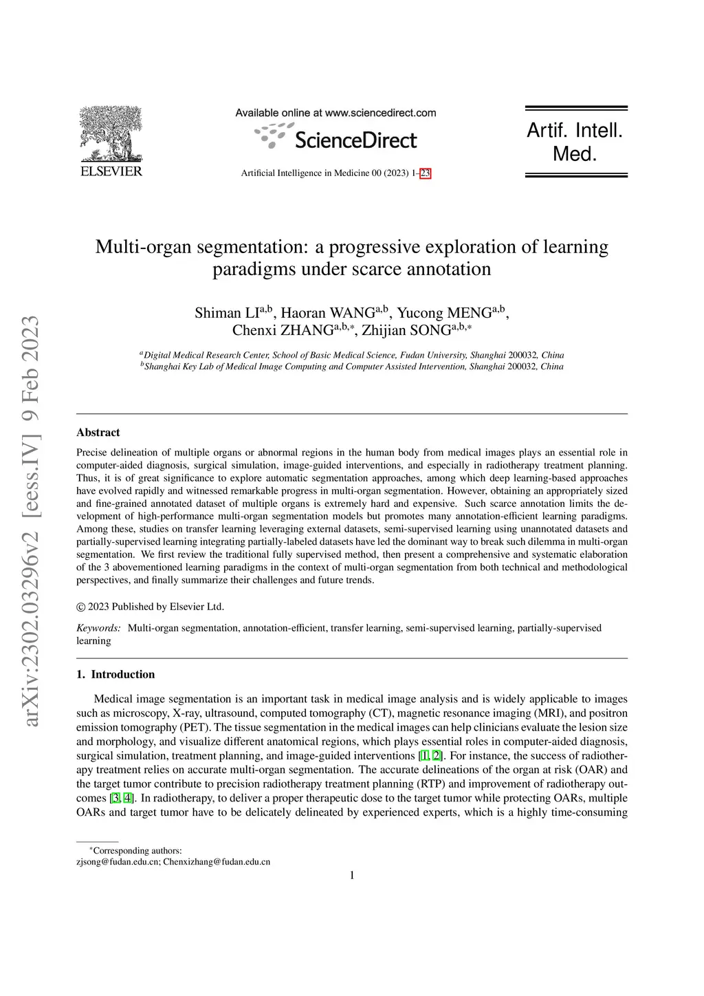 Precise delineation of multiple organs or abnormal regions in the human body from medical images plays an essential role in computer-aided diagnosis, surgical simulation, image-guided interventions, and especially in radiotherapy treatment planning. Thus, it is of great significance to explore automatic segmentation approaches, among which deep learning-based approaches have evolved rapidly and witnessed remarkable progress in multi-organ segmentation. However, obtaining an appropriately sized and fine-grained annotated dataset of multiple organs is extremely hard and expensive. Such scarce annotation limits the development of high-performance multi-organ segmentation models but promotes many annotation-efficient learning paradigms. Among these, studies on transfer learning leveraging external datasets, semi-supervised learning using unannotated datasets and partially-supervised learning integrating partially-labeled datasets have led the dominant way to break such dilemma in multi-organ segmentation. We first review the traditional fully supervised method, then present a comprehensive and systematic elaboration of the 3 abovementioned learning paradigms in the context of multi-organ segmentation from both technical and methodological perspectives, and finally summarize their challenges and future trends.
