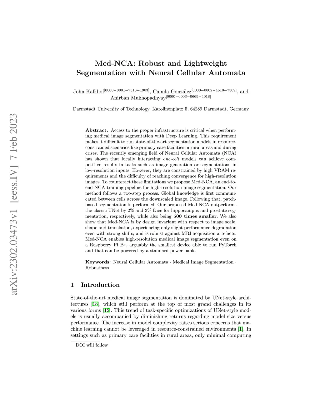 Access to the proper infrastructure is critical when performing medical image segmentation with Deep Learning. This requirement makes it difficult to run state-of-the-art segmentation models in resource-constrained scenarios like primary care facilities in rural areas and during crises. The recently emerging field of Neural Cellular Automata (NCA) has shown that locally interacting one-cell models can achieve competitive results in tasks such as image generation or segmentations in low-resolution inputs. However, they are constrained by high VRAM requirements and the difficulty of reaching convergence for high-resolution images. To counteract these limitations we propose Med-NCA, an end-to-end NCA training pipeline for high-resolution image segmentation. Our method follows a two-step process. Global knowledge is first communicated between cells across the downscaled image. Following that, patch-based segmentation is performed. Our proposed Med-NCA outperforms the classic UNet by 2% and 3% Dice for hippocampus and prostate segmentation, respectively, while also being 500 times smaller. We also show that Med-NCA is by design invariant with respect to image scale, shape and translation, experiencing only slight performance degradation even with strong shifts; and is robust against MRI acquisition artefacts. Med-NCA enables high-resolution medical image segmentation even on a Raspberry Pi B+, arguably the smallest device able to run PyTorch and that can be powered by a standard power bank.