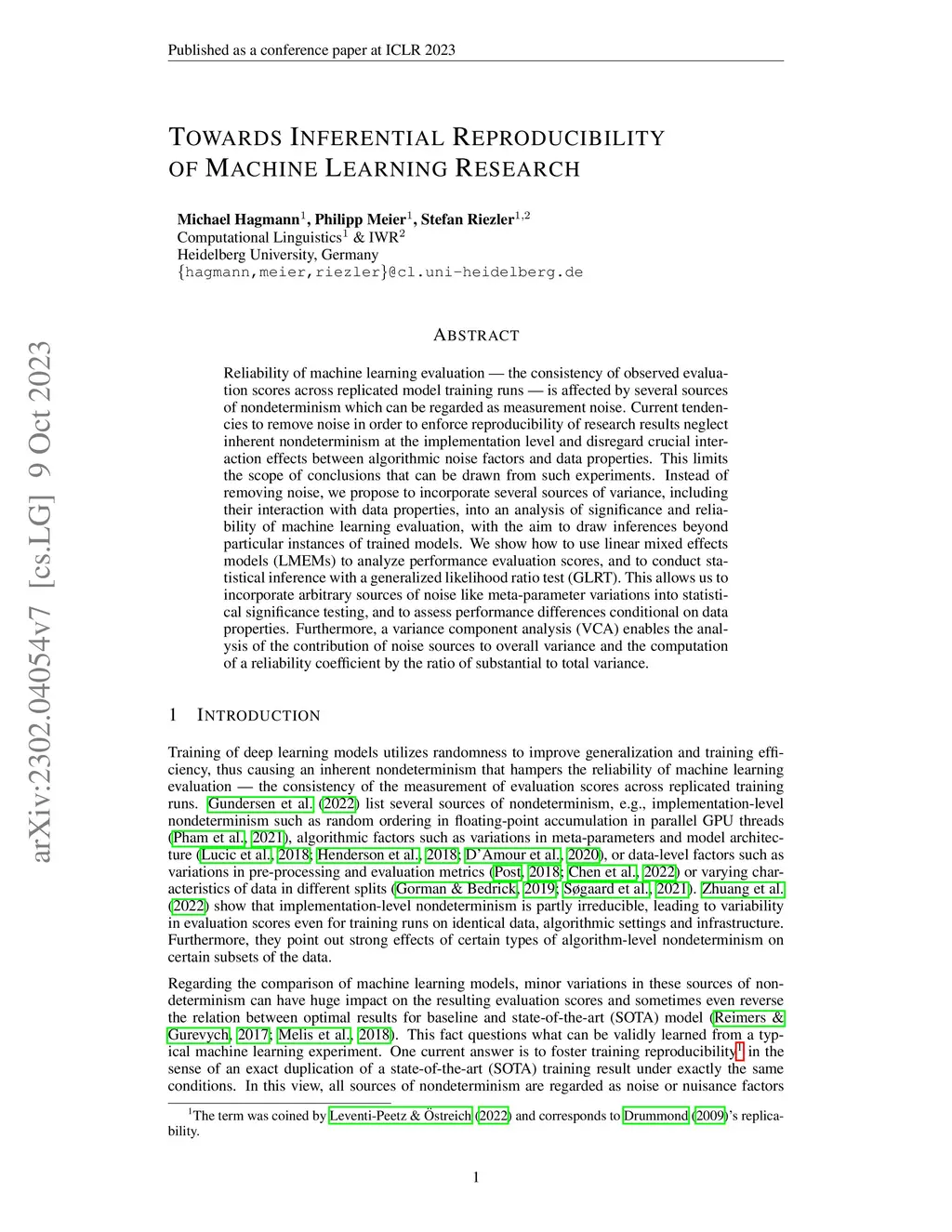 Reliability of machine learning evaluation -- the consistency of observed evaluation scores across replicated model training runs -- is affected by several sources of nondeterminism which can be regarded as measurement noise. Current tendencies to remove noise in order to enforce reproducibility of research results neglect inherent nondeterminism at the implementation level and disregard crucial interaction effects between algorithmic noise factors and data properties. This limits the scope of conclusions that can be drawn from such experiments. Instead of removing noise, we propose to incorporate several sources of variance, including their interaction with data properties, into an analysis of significance and reliability of machine learning evaluation, with the aim to draw inferences beyond particular instances of trained models. We show how to use linear mixed effects models (LMEMs) to analyze performance evaluation scores, and to conduct statistical inference with a generalized likelihood ratio test (GLRT). This allows us to incorporate arbitrary sources of noise like meta-parameter variations into statistical significance testing, and to assess performance differences conditional on data properties. Furthermore, a variance component analysis (VCA) enables the analysis of the contribution of noise sources to overall variance and the computation of a reliability coefficient by the ratio of substantial to total variance.