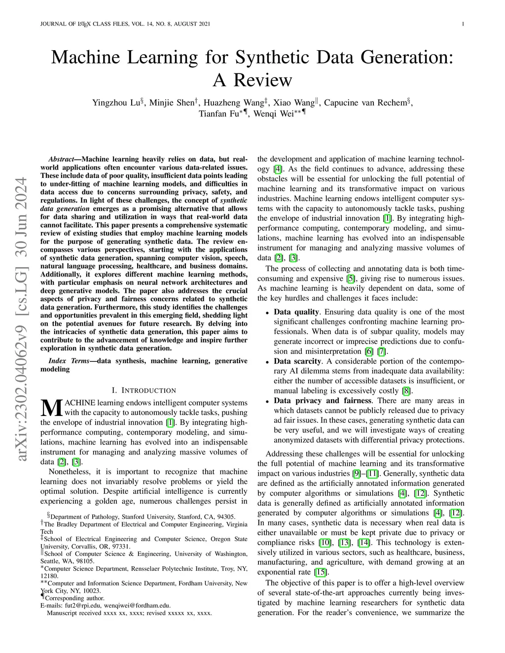 Machine learning heavily relies on data, but real-world applications often encounter various data-related issues. These include data of poor quality, insufficient data points leading to under-fitting of machine learning models, and difficulties in data access due to concerns surrounding privacy, safety, and regulations. In light of these challenges, the concept of synthetic data generation emerges as a promising alternative that allows for data sharing and utilization in ways that real-world data cannot facilitate. This paper presents a comprehensive systematic review of existing studies that employ machine learning models for the purpose of generating synthetic data. The review encompasses various perspectives, starting with the applications of synthetic data generation, spanning computer vision, speech, natural language processing, healthcare, and business domains. Additionally, it explores different machine learning methods, with particular emphasis on neural network architectures and deep generative models. The paper also addresses the crucial aspects of privacy and fairness concerns related to synthetic data generation. Furthermore, this study identifies the challenges and opportunities prevalent in this emerging field, shedding light on the potential avenues for future research. By delving into the intricacies of synthetic data generation, this paper aims to contribute to the advancement of knowledge and inspire further exploration in synthetic data generation.