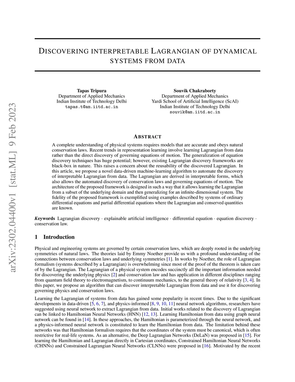 A complete understanding of physical systems requires models that are accurate and obeys natural conservation laws. Recent trends in representation learning involve learning Lagrangian from data rather than the direct discovery of governing equations of motion. The generalization of equation discovery techniques has huge potential; however, existing Lagrangian discovery frameworks are black-box in nature. This raises a concern about the reusability of the discovered Lagrangian. In this article, we propose a novel data-driven machine-learning algorithm to automate the discovery of interpretable Lagrangian from data. The Lagrangian are derived in interpretable forms, which also allows the automated discovery of conservation laws and governing equations of motion. The architecture of the proposed framework is designed in such a way that it allows learning the Lagrangian from a subset of the underlying domain and then generalizing for an infinite-dimensional system. The fidelity of the proposed framework is exemplified using examples described by systems of ordinary differential equations and partial differential equations where the Lagrangian and conserved quantities are known.