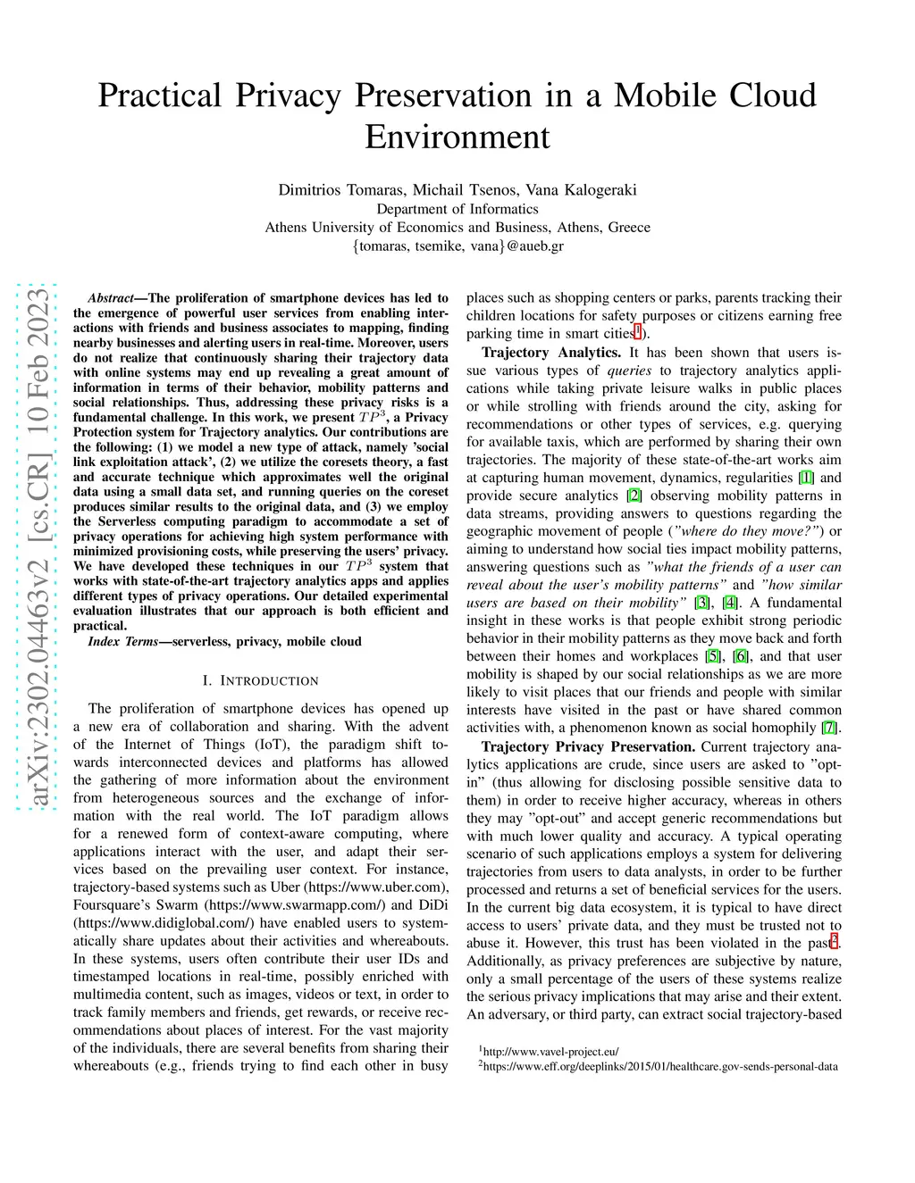The proliferation of smartphone devices has led to the emergence of powerful user services from enabling interactions with friends and business associates to mapping, finding nearby businesses and alerting users in real-time. Moreover, users do not realize that continuously sharing their trajectory data with online systems may end up revealing a great amount of information in terms of their behavior, mobility patterns and social relationships. Thus, addressing these privacy risks is a fundamental challenge. In this work, we present , a Privacy Protection system for Trajectory analytics. Our contributions are the following: (1) we model a new type of attack, namely 'social link exploitation attack', (2) we utilize the coresets theory, a fast and accurate technique which approximates well the original data using a small data set, and running queries on the coreset produces similar results to the original data, and (3) we employ the Serverless computing paradigm to accommodate a set of privacy operations for achieving high system performance with minimized provisioning costs, while preserving the users' privacy. We have developed these techniques in our system that works with state-of-the-art trajectory analytics apps and applies different types of privacy operations. Our detailed experimental evaluation illustrates that our approach is both efficient and practical.