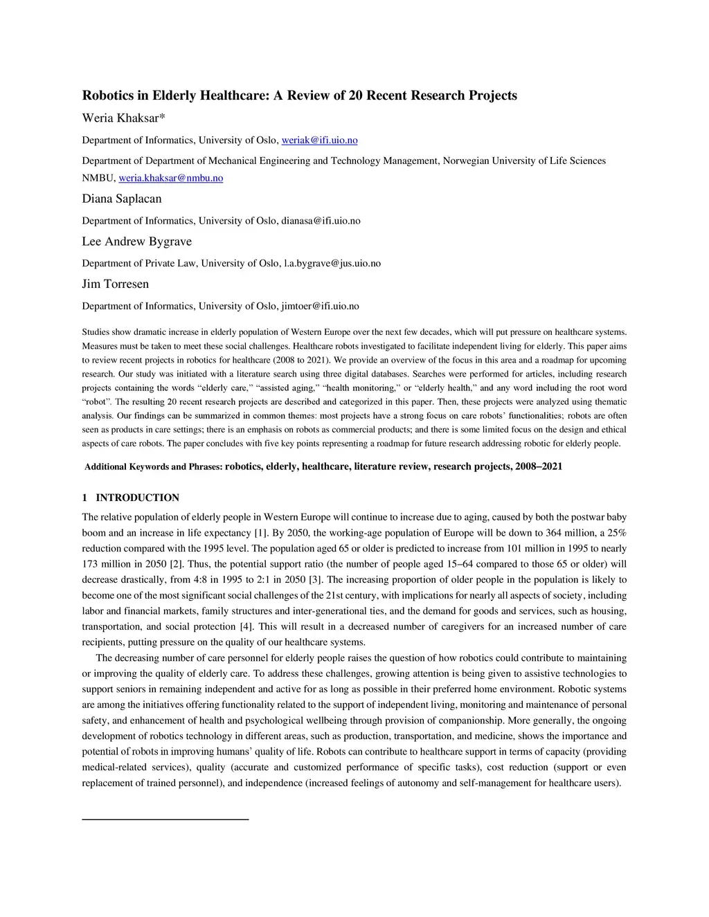 Robotics in Elderly Healthcare: A Review of 20 Recent Research Projects