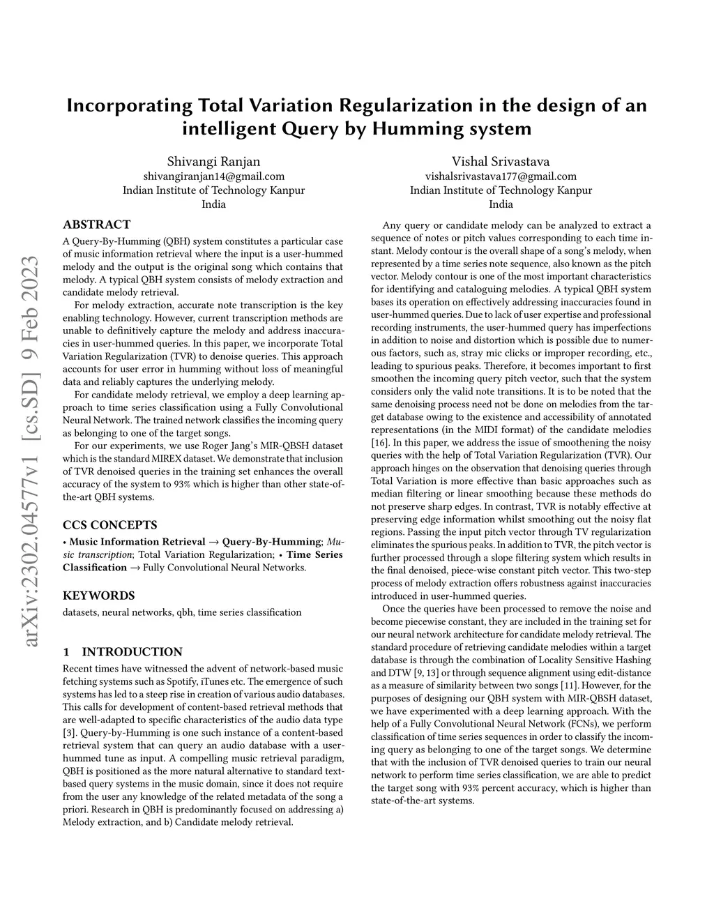 A Query-By-Humming (QBH) system constitutes a particular case of music information retrieval where the input is a user-hummed melody and the output is the original song which contains that melody. A typical QBH system consists of melody extraction and candidate melody retrieval. For melody extraction, accurate note transcription is the key enabling technology. However, current transcription methods are unable to definitively capture the melody and address inaccuracies in user-hummed queries. In this paper, we incorporate Total Variation Regularization (TVR) to denoise queries. This approach accounts for user error in humming without loss of meaningful data and reliably captures the underlying melody. For candidate melody retrieval, we employ a deep learning approach to time series classification using a Fully Convolutional Neural Network. The trained network classifies the incoming query as belonging to one of the target songs. For our experiments, we use Roger Jang's MIR-QBSH dataset which is the standard MIREX dataset. We demonstrate that inclusion of TVR denoised queries in the training set enhances the overall accuracy of the system to 93% which is higher than other state-of-the-art QBH systems.