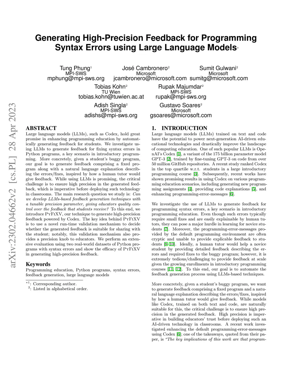 Large language models (LLMs), such as Codex, hold great promise in enhancing programming education by automatically generating feedback for students. We investigate using LLMs to generate feedback for fixing syntax errors in Python programs, a key scenario in introductory programming. More concretely, given a student's buggy program, our goal is to generate feedback comprising a fixed program along with a natural language explanation describing the errors/fixes, inspired by how a human tutor would give feedback. While using LLMs is promising, the critical challenge is to ensure high precision in the generated feedback, which is imperative before deploying such technology in classrooms. The main research question we study is: Can we develop LLMs-based feedback generation techniques with a tunable precision parameter, giving educators quality control over the feedback that students receive? To this end, we introduce PyFiXV, our technique to generate high-precision feedback powered by Codex. The key idea behind PyFiXV is to use a novel run-time validation mechanism to decide whether the generated feedback is suitable for sharing with the student; notably, this validation mechanism also provides a precision knob to educators. We perform an extensive evaluation using two real-world datasets of Python programs with syntax errors and show the efficacy of PyFiXV in generating high-precision feedback.