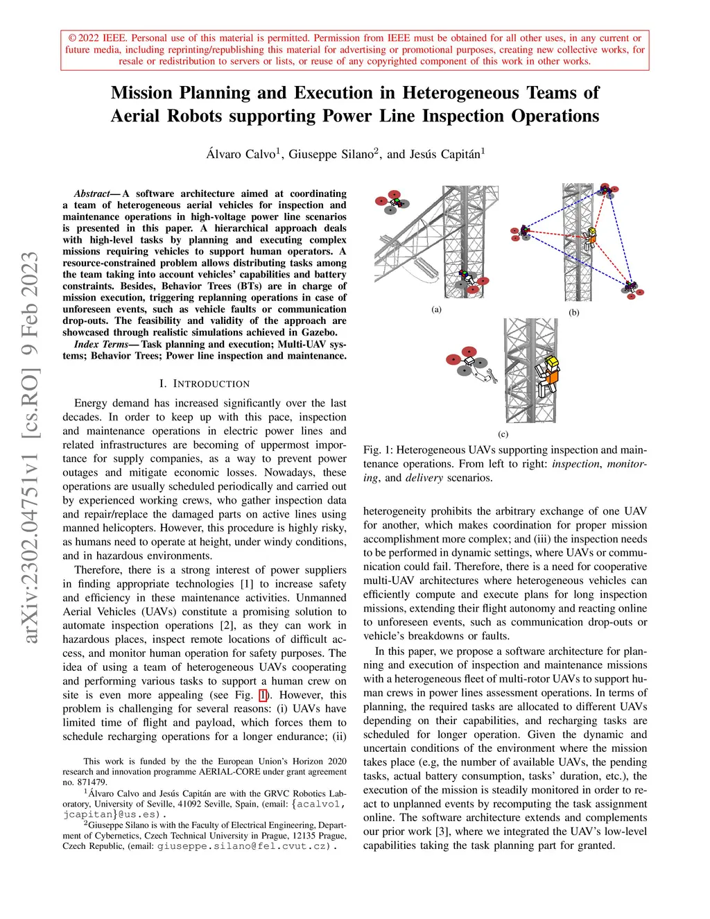 A software architecture aimed at coordinating a team of heterogeneous aerial vehicles for inspection and maintenance operations in high-voltage power line scenarios is presented in this paper. A hierarchical approach deals with high-level tasks by planning and executing complex missions requiring vehicles to support human operators. A resource-constrained problem allows distributing tasks among the team taking into account vehicles' capabilities and battery constraints. Besides, Behavior Trees (BTs) are in charge of mission execution, triggering replanning operations in case of unforeseen events, such as vehicle faults or communication drop-outs. The feasibility and validity of the approach are showcased through realistic simulations achieved in Gazebo.