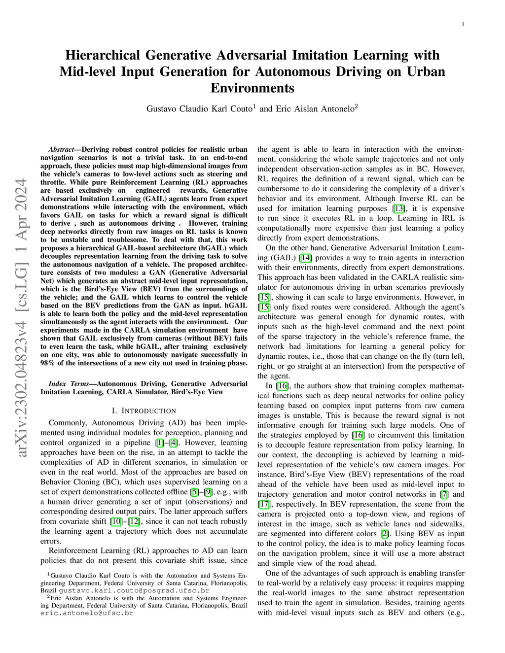 Deriving robust control policies for realistic urban navigation scenarios is not a trivial task. In an end-to-end approach, these policies must map high-dimensional images from the vehicle's cameras to low-level actions such as steering and throttle. While pure Reinforcement Learning (RL) approaches are based exclusively on engineered rewards, Generative Adversarial Imitation Learning (GAIL) agents learn from expert demonstrations while interacting with the environment, which favors GAIL on tasks for which a reward signal is difficult to derive, such as autonomous driving. However, training deep networks directly from raw images on RL tasks is known to be unstable and troublesome. To deal with that, this work proposes a hierarchical GAIL-based architecture (hGAIL) which decouples representation learning from the driving task to solve the autonomous navigation of a vehicle. The proposed architecture consists of two modules: a GAN (Generative Adversarial Net) which generates an abstract mid-level input representation, which is the Bird's-Eye View (BEV) from the surroundings of the vehicle; and the GAIL which learns to control the vehicle based on the BEV predictions from the GAN as input. hGAIL is able to learn both the policy and the mid-level representation simultaneously as the agent interacts with the environment. Our experiments made in the CARLA simulation environment have shown that GAIL exclusively from cameras without BEV) fails to even learn the task, while hGAIL, after training exclusively on one city, was able to autonomously navigate successfully in 98% of the intersections of a new city not used in training phase.