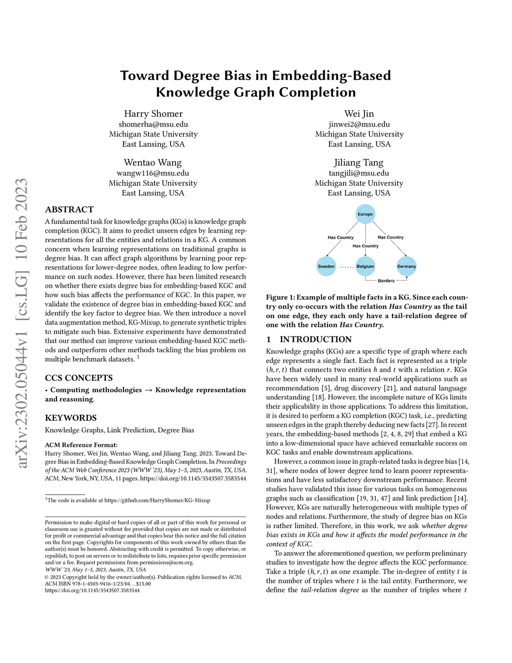A fundamental task for knowledge graphs (KGs) is knowledge graph completion (KGC). It aims to predict unseen edges by learning representations for all the entities and relations in a KG. A common concern when learning representations on traditional graphs is degree bias. It can affect graph algorithms by learning poor representations for lower-degree nodes, often leading to low performance on such nodes. However, there has been limited research on whether there exists degree bias for embedding-based KGC and how such bias affects the performance of KGC. In this paper, we validate the existence of degree bias in embedding-based KGC and identify the key factor to degree bias. We then introduce a novel data augmentation method, KG-Mixup, to generate synthetic triples to mitigate such bias. Extensive experiments have demonstrated that our method can improve various embedding-based KGC methods and outperform other methods tackling the bias problem on multiple benchmark datasets.