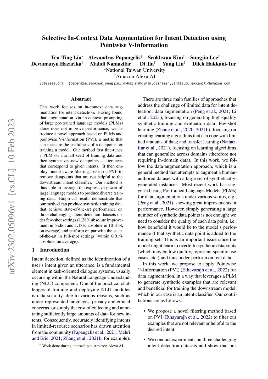 This work focuses on in-context data augmentation for intent detection. Having found that augmentation via in-context prompting of large pre-trained language models (PLMs) alone does not improve performance, we introduce a novel approach based on PLMs and pointwise V-information (PVI), a metric that can measure the usefulness of a datapoint for training a model. Our method first fine-tunes a PLM on a small seed of training data and then synthesizes new datapoints - utterances that correspond to given intents. It then employs intent-aware filtering, based on PVI, to remove datapoints that are not helpful to the downstream intent classifier. Our method is thus able to leverage the expressive power of large language models to produce diverse training data. Empirical results demonstrate that our method can produce synthetic training data that achieve state-of-the-art performance on three challenging intent detection datasets under few-shot settings (1.28% absolute improvement in 5-shot and 1.18% absolute in 10-shot, on average) and perform on par with the state-of-the-art in full-shot settings (within 0.01% absolute, on average).