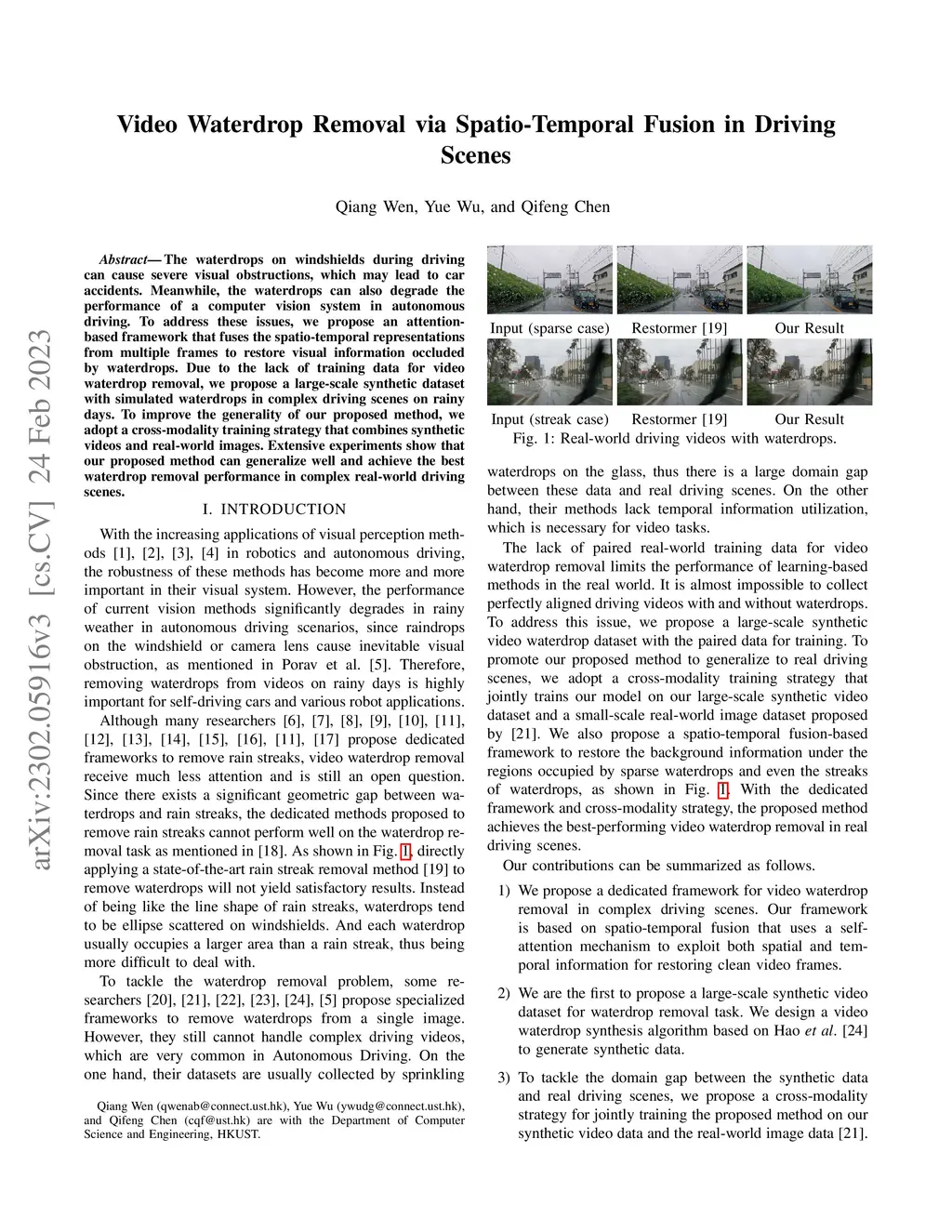 The waterdrops on windshields during driving can cause severe visual obstructions, which may lead to car accidents. Meanwhile, the waterdrops can also degrade the performance of a computer vision system in autonomous driving. To address these issues, we propose an attention-based framework that fuses the spatio-temporal representations from multiple frames to restore visual information occluded by waterdrops. Due to the lack of training data for video waterdrop removal, we propose a large-scale synthetic dataset with simulated waterdrops in complex driving scenes on rainy days. To improve the generality of our proposed method, we adopt a cross-modality training strategy that combines synthetic videos and real-world images. Extensive experiments show that our proposed method can generalize well and achieve the best waterdrop removal performance in complex real-world driving scenes.