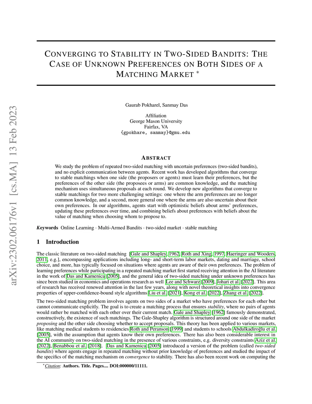 Converging to Stability in Two-Sided Bandits: The Case of Unknown