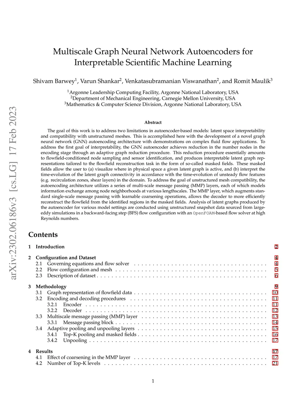 The goal of this work is to address two limitations in autoencoder-based models: latent space interpretability and compatibility with unstructured meshes. This is accomplished here with the development of a novel graph neural network (GNN) autoencoding architecture with demonstrations on complex fluid flow applications. To address the first goal of interpretability, the GNN autoencoder achieves reduction in the number nodes in the encoding stage through an adaptive graph reduction procedure. This reduction procedure essentially amounts to flowfield-conditioned node sampling and sensor identification, and produces interpretable latent graph representations tailored to the flowfield reconstruction task in the form of so-called masked fields. These masked fields allow the user to (a) visualize where in physical space a given latent graph is active, and (b) interpret the time-evolution of the latent graph connectivity in accordance with the time-evolution of unsteady flow features (e.g. recirculation zones, shear layers) in the domain. To address the goal of unstructured mesh compatibility, the autoencoding architecture utilizes a series of multi-scale message passing (MMP) layers, each of which models information exchange among node neighborhoods at various lengthscales. The MMP layer, which augments standard single-scale message passing with learnable coarsening operations, allows the decoder to more efficiently reconstruct the flowfield from the identified regions in the masked fields. Analysis of latent graphs produced by the autoencoder for various model settings are conducted using using unstructured snapshot data sourced from large-eddy simulations in a backward-facing step (BFS) flow configuration with an OpenFOAM-based flow solver at high Reynolds numbers.