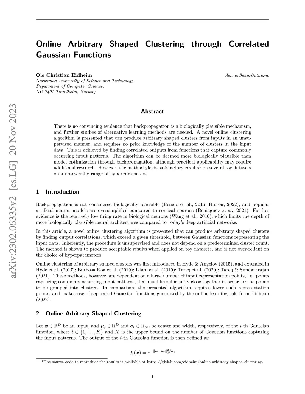 There is no convincing evidence that backpropagation is a biologically plausible mechanism, and further studies of alternative learning methods are needed. A novel online clustering algorithm is presented that can produce arbitrary shaped clusters from inputs in an unsupervised manner, and requires no prior knowledge of the number of clusters in the input data. This is achieved by finding correlated outputs from functions that capture commonly occurring input patterns. The algorithm can be deemed more biologically plausible than model optimization through backpropagation, although practical applicability may require additional research. However, the method yields satisfactory results on several toy datasets on a noteworthy range of hyperparameters.