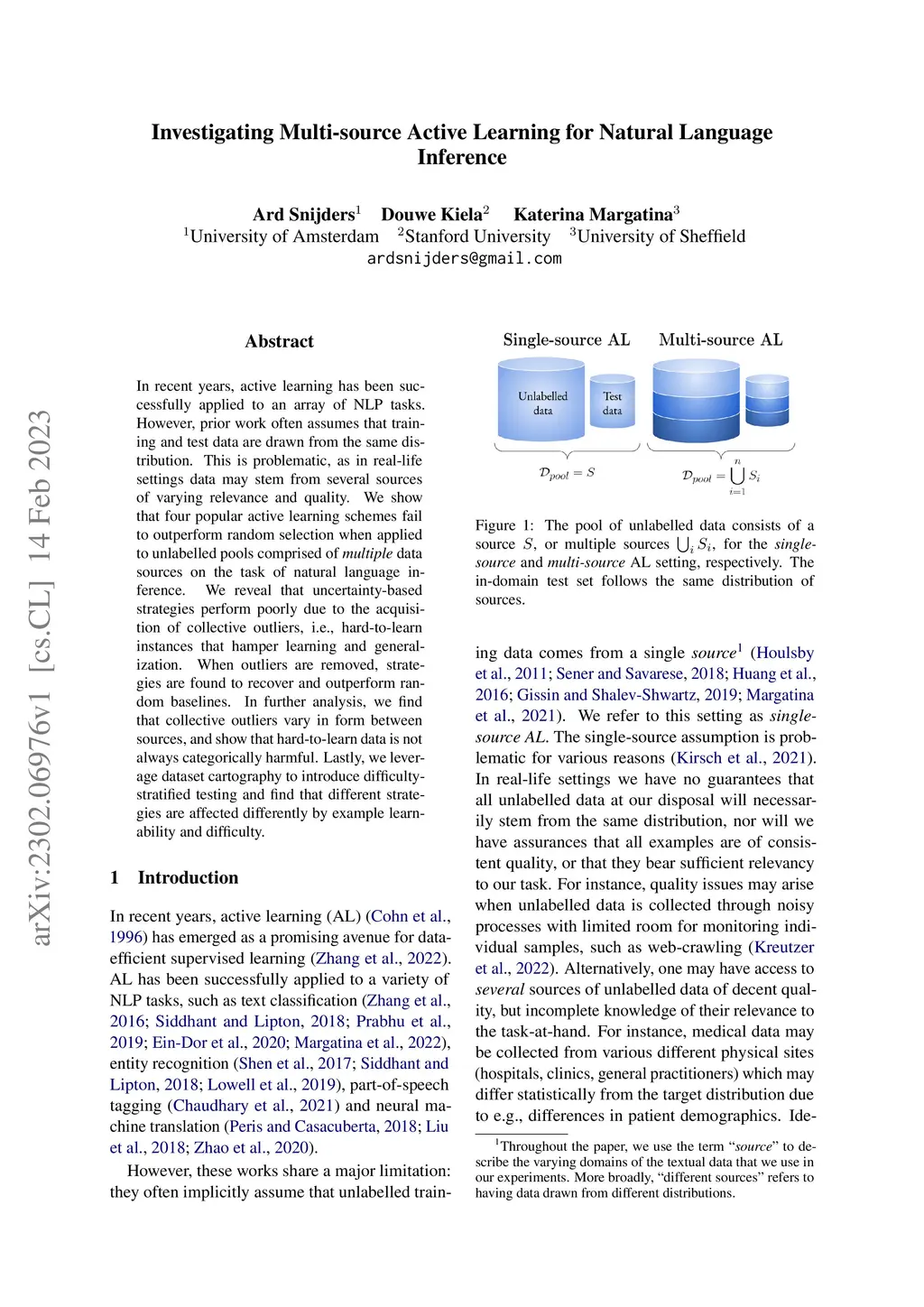 In recent years, active learning has been successfully applied to an array of NLP tasks. However, prior work often assumes that training and test data are drawn from the same distribution. This is problematic, as in real-life settings data may stem from several sources of varying relevance and quality. We show that four popular active learning schemes fail to outperform random selection when applied to unlabelled pools comprised of multiple data sources on the task of natural language inference. We reveal that uncertainty-based strategies perform poorly due to the acquisition of collective outliers, i.e., hard-to-learn instances that hamper learning and generalization. When outliers are removed, strategies are found to recover and outperform random baselines. In further analysis, we find that collective outliers vary in form between sources, and show that hard-to-learn data is not always categorically harmful. Lastly, we leverage dataset cartography to introduce difficulty-stratified testing and find that different strategies are affected differently by example learnability and difficulty.