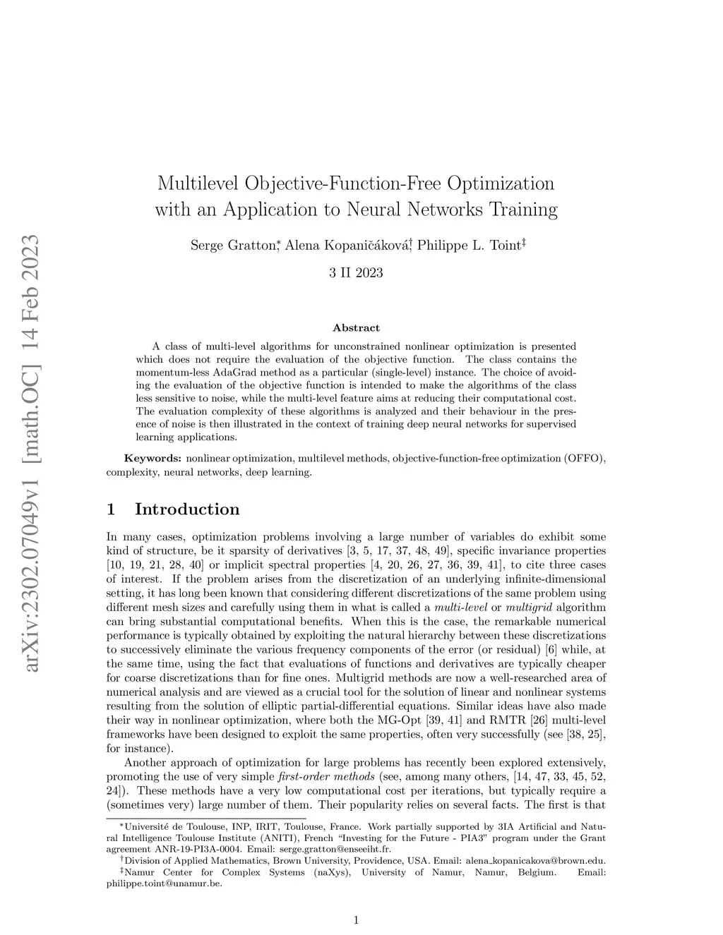 A class of multi-level algorithms for unconstrained nonlinear optimization is presented which does not require the evaluation of the objective function. The class contains the momentum-less AdaGrad method as a particular (single-level) instance. The choice of avoiding the evaluation of the objective function is intended to make the algorithms of the class less sensitive to noise, while the multi-level feature aims at reducing their computational cost. The evaluation complexity of these algorithms is analyzed and their behaviour in the presence of noise is then illustrated in the context of training deep neural networks for supervised learning applications.