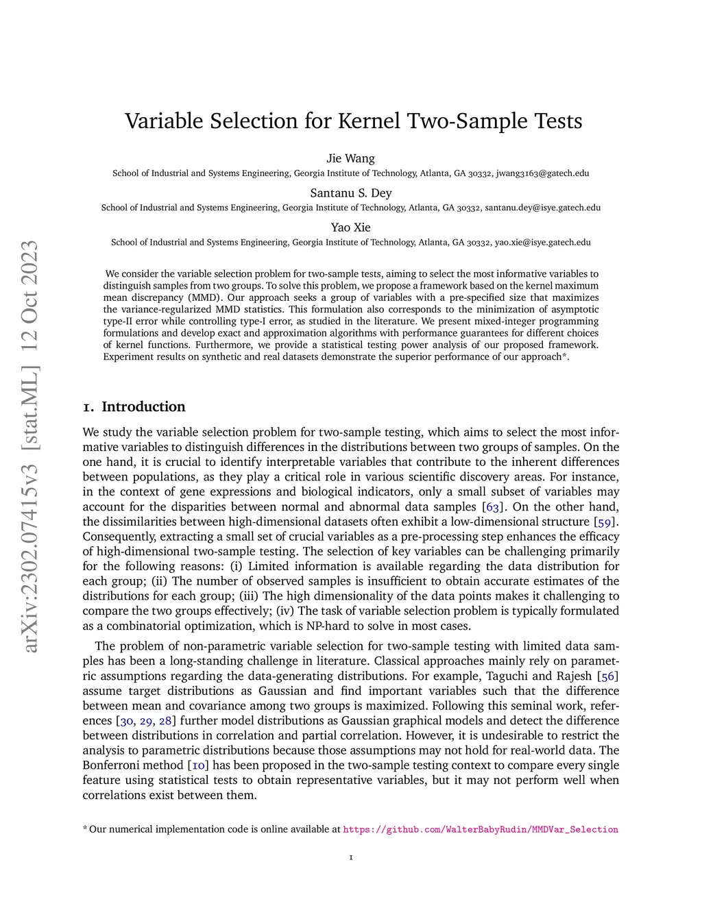 We consider the variable selection problem for two-sample tests, aiming to select the most informative variables to distinguish samples from two groups. To solve this problem, we propose a framework based on the kernel maximum mean discrepancy (MMD). Our approach seeks a group of variables with a pre-specified size that maximizes the variance-regularized MMD statistics. This formulation also corresponds to the minimization of asymptotic type-II error while controlling type-I error, as studied in the literature. We present mixed-integer programming formulations and develop exact and approximation algorithms with performance guarantees for different choices of kernel functions. Furthermore, we provide a statistical testing power analysis of our proposed framework. Experiment results on synthetic and real datasets demonstrate the superior performance of our approach.