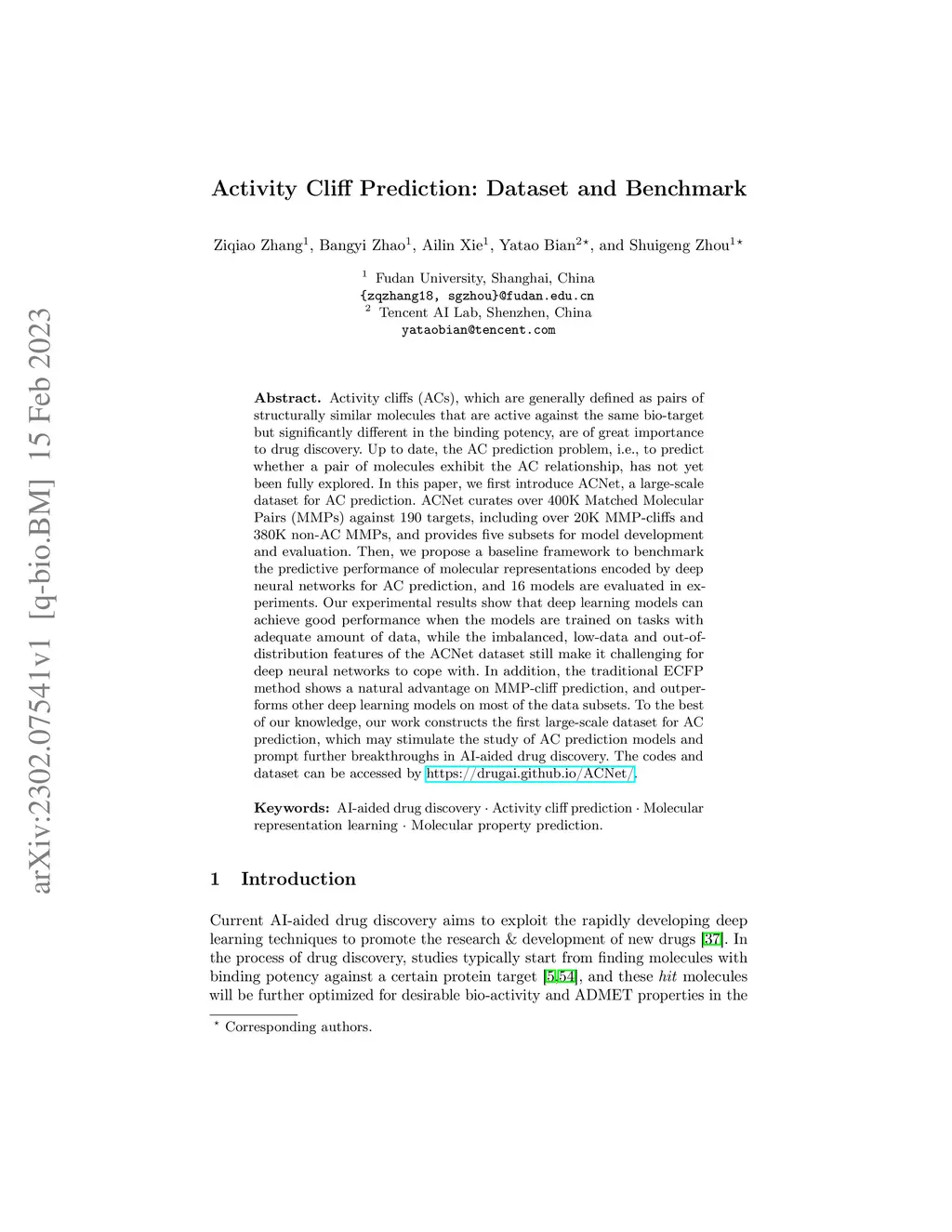 Activity cliffs (ACs), which are generally defined as pairs of structurally similar molecules that are active against the same bio-target but significantly different in the binding potency, are of great importance to drug discovery. Up to date, the AC prediction problem, i.e., to predict whether a pair of molecules exhibit the AC relationship, has not yet been fully explored. In this paper, we first introduce ACNet, a large-scale dataset for AC prediction. ACNet curates over 400K Matched Molecular Pairs (MMPs) against 190 targets, including over 20K MMP-cliffs and 380K non-AC MMPs, and provides five subsets for model development and evaluation. Then, we propose a baseline framework to benchmark the predictive performance of molecular representations encoded by deep neural networks for AC prediction, and 16 models are evaluated in experiments. Our experimental results show that deep learning models can achieve good performance when the models are trained on tasks with adequate amount of data, while the imbalanced, low-data and out-of-distribution features of the ACNet dataset still make it challenging for deep neural networks to cope with. In addition, the traditional ECFP method shows a natural advantage on MMP-cliff prediction, and outperforms other deep learning models on most of the data subsets. To the best of our knowledge, our work constructs the first large-scale dataset for AC prediction, which may stimulate the study of AC prediction models and prompt further breakthroughs in AI-aided drug discovery. The codes and dataset can be accessed by https://drugai.github.io/ACNet/.