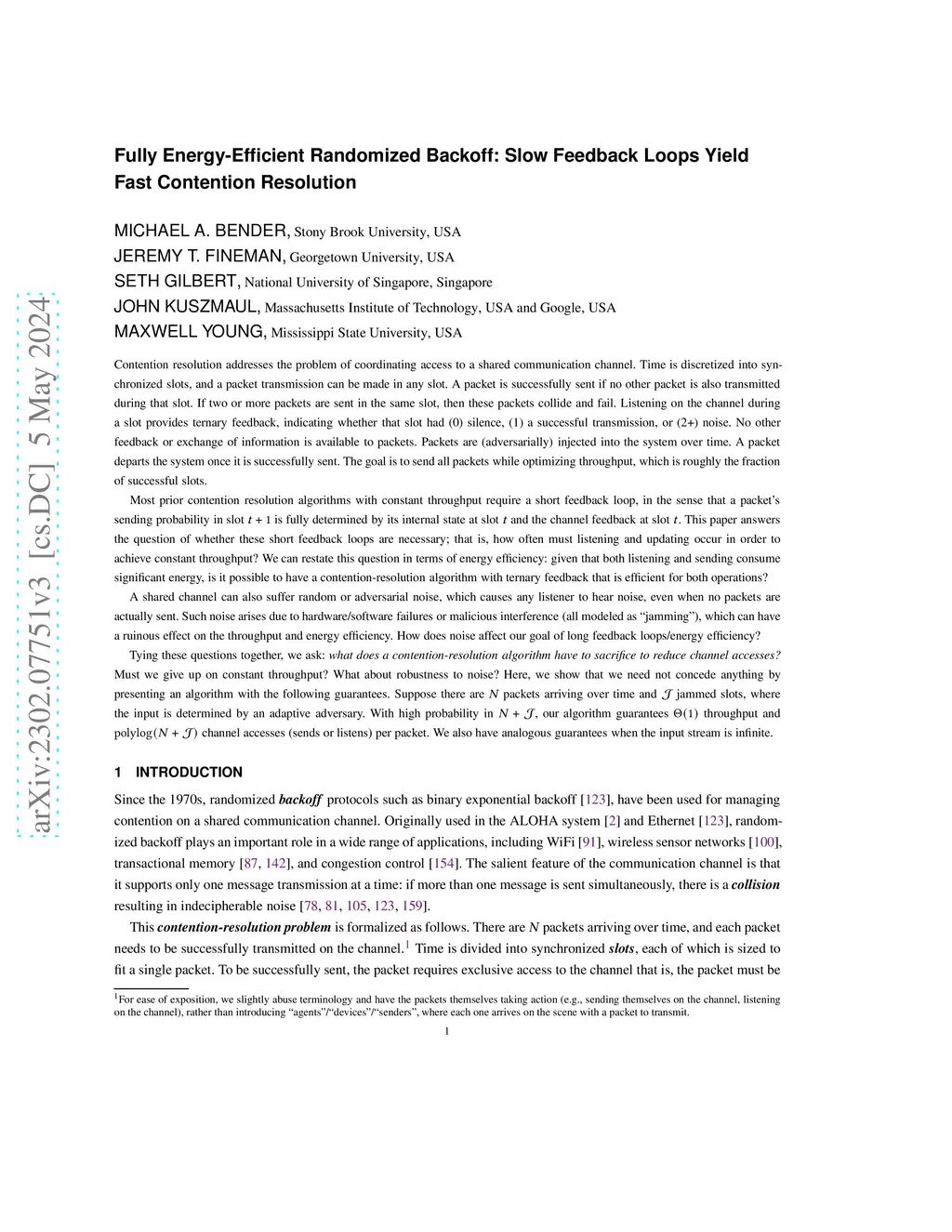Contention resolution addresses the problem of coordinating access to a shared channel. Time proceeds in slots, and a packet transmission can be made in any slot. A packet is successfully sent if no other packet is also transmitted during that slot. If two or more packets are sent in the same slot, then none of these transmissions succeed. Listening during a slot gives ternary feedback, indicating if that slot had (0) silence, (1) a successful transmission, or (2+) noise. No other feedback is available. Packets are (adversarially) injected into the system over time. A packet departs the system once it is successful. The goal is to send all packets while optimizing throughput, which is roughly the fraction of successful slots. Most prior algorithms with constant throughput require a short feedback loop, in the sense that a packet's sending probability in slot t+1 is fully determined by its internal state at slot t and the channel feedback at slot t. An open question is whether these short feedback loops are necessary; that is, how often must listening and updating occur in order to achieve constant throughput? This question addresses energy efficiency, since both listening and sending consume significant energy. The channel can also suffer adversarial noise ("jamming"), which causes any listener to hear noise, even when no packets are sent. How does jamming affect our goal of long feedback loops/energy efficiency? Connecting these questions, we ask: what does a contention-resolution algorithm have to sacrifice to reduce channel accesses? Must we give up on constant throughput or robustness to noise? Here, we show that we need not concede anything. Suppose there are N packets and J jammed slots, where the input is determined by an adaptive adversary. We give an algorithm that, with high probability in N+J, has constant throughput and polylog(N+J) channel accesses per packet.