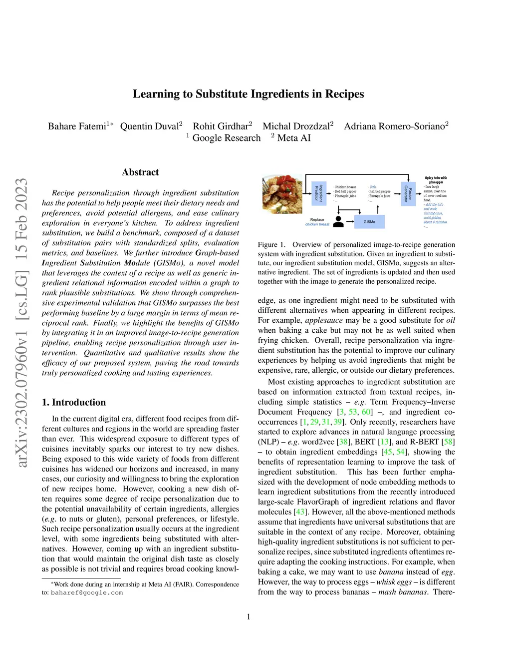 Recipe personalization through ingredient substitution has the potential to help people meet their dietary needs and preferences, avoid potential allergens, and ease culinary exploration in everyone's kitchen. To address ingredient substitution, we build a benchmark, composed of a dataset of substitution pairs with standardized splits, evaluation metrics, and baselines. We further introduce Graph-based Ingredient Substitution Module (GISMo), a novel model that leverages the context of a recipe as well as generic ingredient relational information encoded within a graph to rank plausible substitutions. We show through comprehensive experimental validation that GISMo surpasses the best performing baseline by a large margin in terms of mean reciprocal rank. Finally, we highlight the benefits of GISMo by integrating it in an improved image-to-recipe generation pipeline, enabling recipe personalization through user intervention. Quantitative and qualitative results show the efficacy of our proposed system, paving the road towards truly personalized cooking and tasting experiences.