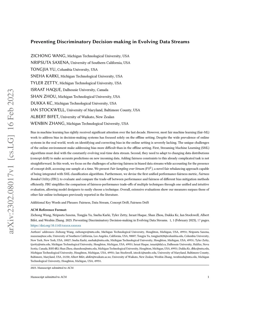 Bias in machine learning has rightly received significant attention over the last decade. However, most fair machine learning (fair-ML) work to address bias in decision-making systems has focused solely on the offline setting. Despite the wide prevalence of online systems in the real world, work on identifying and correcting bias in the online setting is severely lacking. The unique challenges of the online environment make addressing bias more difficult than in the offline setting. First, Streaming Machine Learning (SML) algorithms must deal with the constantly evolving real-time data stream. Second, they need to adapt to changing data distributions (concept drift) to make accurate predictions on new incoming data. Adding fairness constraints to this already complicated task is not straightforward. In this work, we focus on the challenges of achieving fairness in biased data streams while accounting for the presence of concept drift, accessing one sample at a time. We present Fair Sampling over Stream (), a novel fair rebalancing approach capable of being integrated with SML classification algorithms. Furthermore, we devise the first unified performance-fairness metric, Fairness Bonded Utility (FBU), to evaluate and compare the trade-off between performance and fairness of different bias mitigation methods efficiently. FBU simplifies the comparison of fairness-performance trade-offs of multiple techniques through one unified and intuitive evaluation, allowing model designers to easily choose a technique. Overall, extensive evaluations show our measures surpass those of other fair online techniques previously reported in the literature.
