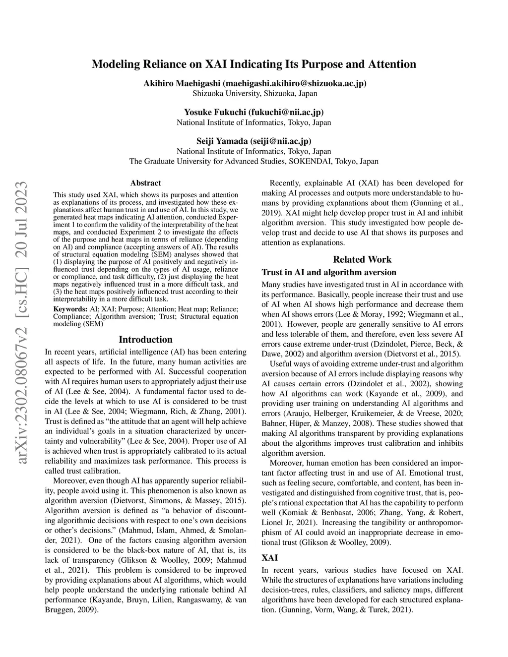 This study used XAI, which shows its purposes and attention as explanations of its process, and investigated how these explanations affect human trust in and use of AI. In this study, we generated heat maps indicating AI attention, conducted Experiment 1 to confirm the validity of the interpretability of the heat maps, and conducted Experiment 2 to investigate the effects of the purpose and heat maps in terms of reliance (depending on AI) and compliance (accepting answers of AI). The results of structural equation modeling (SEM) analyses showed that (1) displaying the purpose of AI positively and negatively influenced trust depending on the types of AI usage, reliance or compliance, and task difficulty, (2) just displaying the heat maps negatively influenced trust in a more difficult task, and (3) the heat maps positively influenced trust according to their interpretability in a more difficult task.