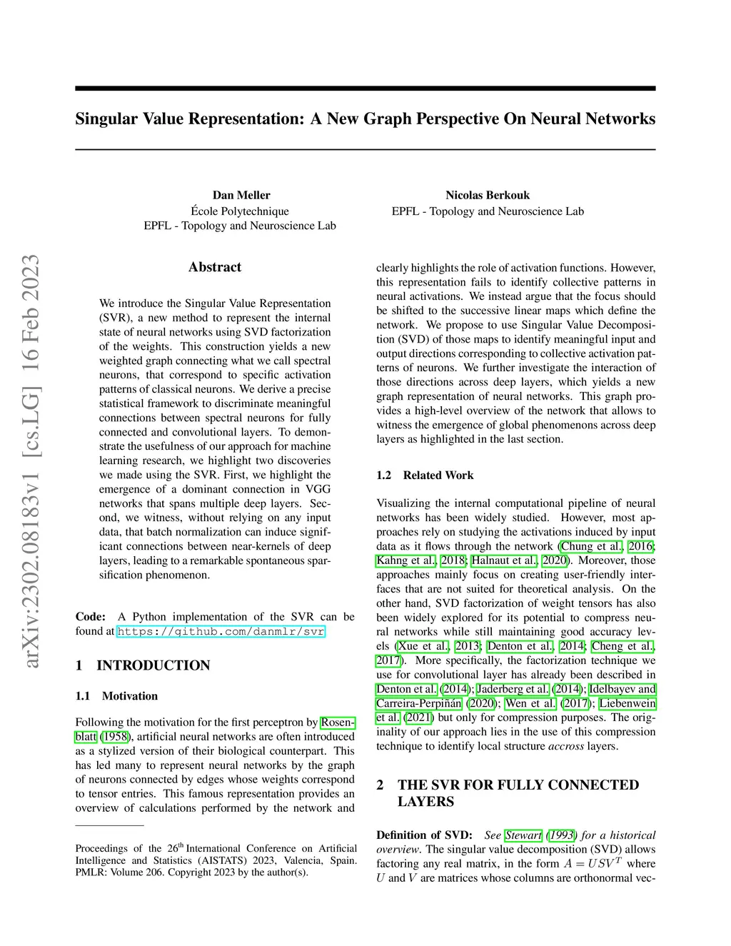 We introduce the Singular Value Representation (SVR), a new method to represent the internal state of neural networks using SVD factorization of the weights. This construction yields a new weighted graph connecting what we call spectral neurons, that correspond to specific activation patterns of classical neurons. We derive a precise statistical framework to discriminate meaningful connections between spectral neurons for fully connected and convolutional layers. To demonstrate the usefulness of our approach for machine learning research, we highlight two discoveries we made using the SVR. First, we highlight the emergence of a dominant connection in VGG networks that spans multiple deep layers. Second, we witness, without relying on any input data, that batch normalization can induce significant connections between near-kernels of deep layers, leading to a remarkable spontaneous sparsification phenomenon.