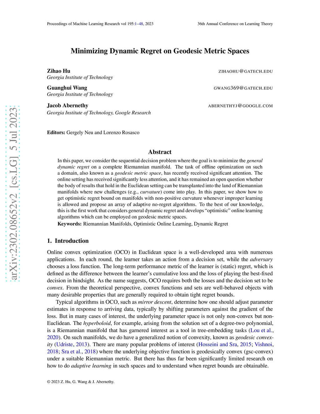 In this paper, we consider the sequential decision problem where the goal is to minimize the general dynamic regret on a complete Riemannian manifold. The task of offline optimization on such a domain, also known as a geodesic metric space, has recently received significant attention. The online setting has received significantly less attention, and it has remained an open question whether the body of results that hold in the Euclidean setting can be transplanted into the land of Riemannian manifolds where new challenges (e.g., curvature) come into play. In this paper, we show how to get optimistic regret bound on manifolds with non-positive curvature whenever improper learning is allowed and propose an array of adaptive no-regret algorithms. To the best of our knowledge, this is the first work that considers general dynamic regret and develops "optimistic" online learning algorithms which can be employed on geodesic metric spaces.