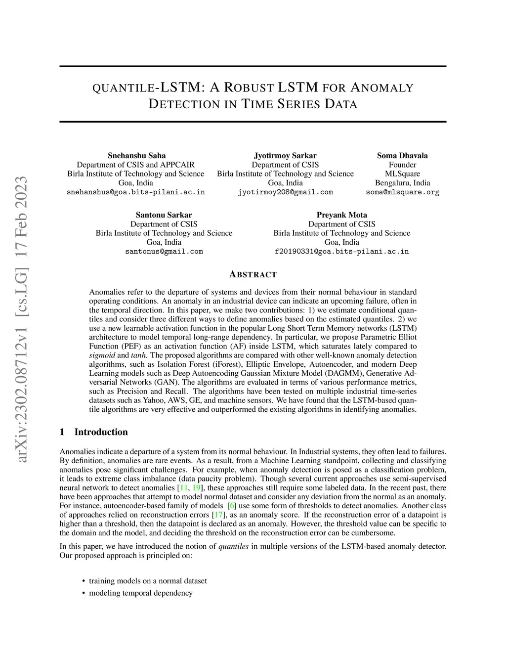 Anomalies refer to the departure of systems and devices from their normal behaviour in standard operating conditions. An anomaly in an industrial device can indicate an upcoming failure, often in the temporal direction. In this paper, we make two contributions: 1) we estimate conditional quantiles and consider three different ways to define anomalies based on the estimated quantiles. 2) we use a new learnable activation function in the popular Long Short Term Memory networks (LSTM) architecture to model temporal long-range dependency. In particular, we propose Parametric Elliot Function (PEF) as an activation function (AF) inside LSTM, which saturates lately compared to sigmoid and tanh. The proposed algorithms are compared with other well-known anomaly detection algorithms, such as Isolation Forest (iForest), Elliptic Envelope, Autoencoder, and modern Deep Learning models such as Deep Autoencoding Gaussian Mixture Model (DAGMM), Generative Adversarial Networks (GAN). The algorithms are evaluated in terms of various performance metrics, such as Precision and Recall. The algorithms have been tested on multiple industrial time-series datasets such as Yahoo, AWS, GE, and machine sensors. We have found that the LSTM-based quantile algorithms are very effective and outperformed the existing algorithms in identifying anomalies.