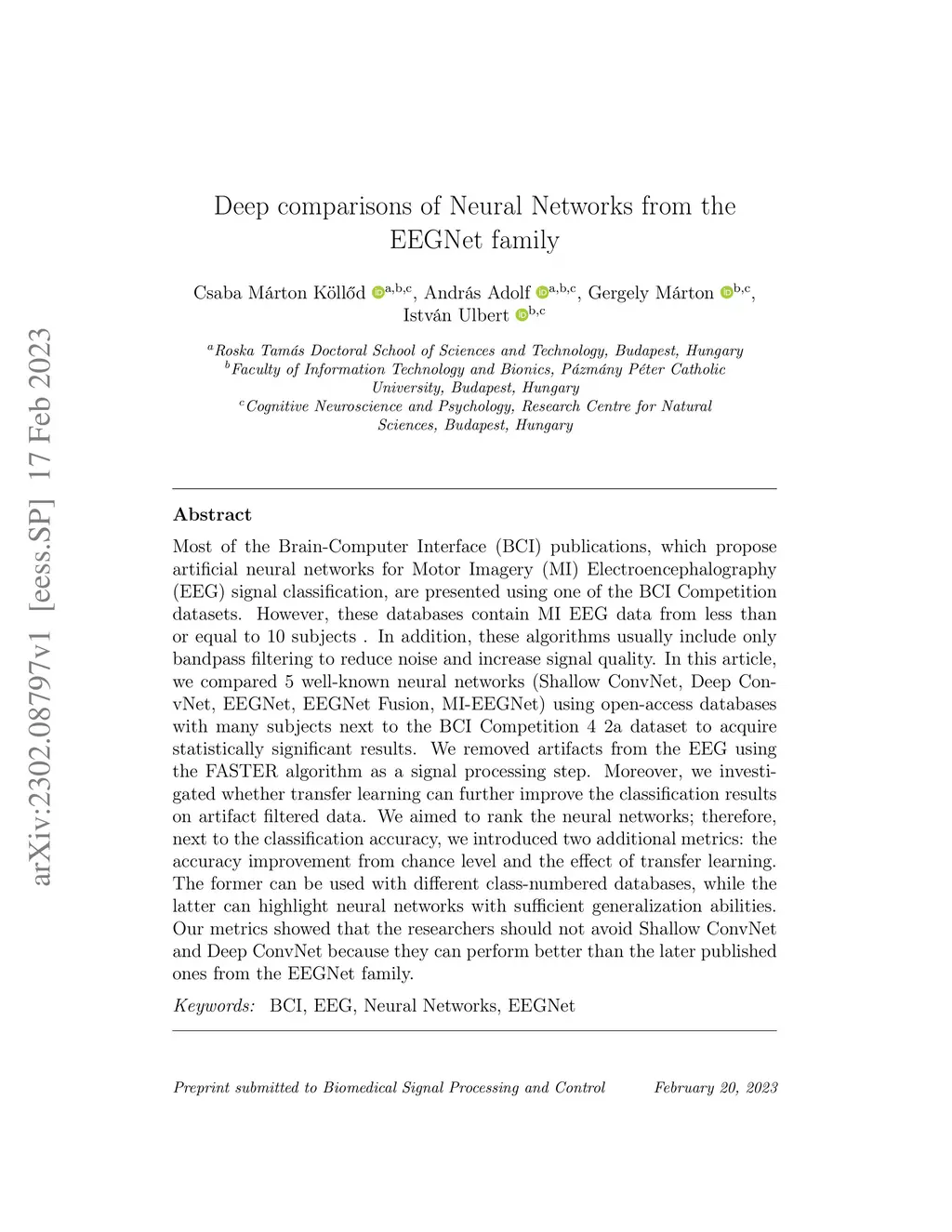 Most of the Brain-Computer Interface (BCI) publications, which propose artificial neural networks for Motor Imagery (MI) Electroencephalography (EEG) signal classification, are presented using one of the BCI Competition datasets. However, these databases contain MI EEG data from less than or equal to 10 subjects . In addition, these algorithms usually include only bandpass filtering to reduce noise and increase signal quality. In this article, we compared 5 well-known neural networks (Shallow ConvNet, Deep ConvNet, EEGNet, EEGNet Fusion, MI-EEGNet) using open-access databases with many subjects next to the BCI Competition 4 2a dataset to acquire statistically significant results. We removed artifacts from the EEG using the FASTER algorithm as a signal processing step. Moreover, we investigated whether transfer learning can further improve the classification results on artifact filtered data. We aimed to rank the neural networks; therefore, next to the classification accuracy, we introduced two additional metrics: the accuracy improvement from chance level and the effect of transfer learning. The former can be used with different class-numbered databases, while the latter can highlight neural networks with sufficient generalization abilities. Our metrics showed that the researchers should not avoid Shallow ConvNet and Deep ConvNet because they can perform better than the later published ones from the EEGNet family.