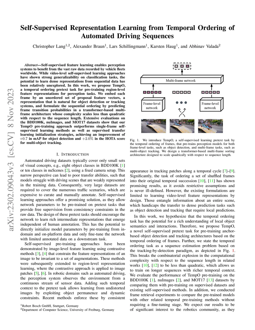 Self-supervised feature learning enables perception systems to benefit from the vast raw data recorded by vehicle fleets worldwide. While video-level self-supervised learning approaches have shown strong generalizability on classification tasks, the potential to learn dense representations from sequential data has been relatively unexplored. In this work, we propose TempO, a temporal ordering pretext task for pre-training region-level feature representations for perception tasks. We embed each frame by an unordered set of proposal feature vectors, a representation that is natural for object detection or tracking systems, and formulate the sequential ordering by predicting frame transition probabilities in a transformer-based multi-frame architecture whose complexity scales less than quadratic with respect to the sequence length. Extensive evaluations on the BDD100K, nuImages, and MOT17 datasets show that our TempO pre-training approach outperforms single-frame self-supervised learning methods as well as supervised transfer learning initialization strategies, achieving an improvement of +0.7% in mAP for object detection and +2.0% in the HOTA score for multi-object tracking.
