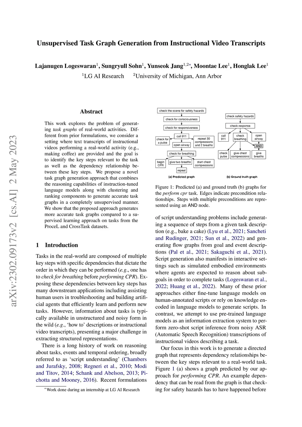 This work explores the problem of generating task graphs of real-world activities. Different from prior formulations, we consider a setting where text transcripts of instructional videos performing a real-world activity (e.g., making coffee) are provided and the goal is to identify the key steps relevant to the task as well as the dependency relationship between these key steps. We propose a novel task graph generation approach that combines the reasoning capabilities of instruction-tuned language models along with clustering and ranking components to generate accurate task graphs in a completely unsupervised manner. We show that the proposed approach generates more accurate task graphs compared to a supervised learning approach on tasks from the ProceL and CrossTask datasets.