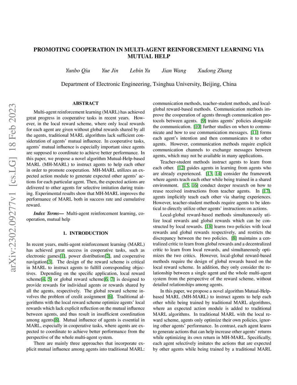 Multi-agent reinforcement learning (MARL) has achieved great progress in cooperative tasks in recent years. However, in the local reward scheme, where only local rewards for each agent are given without global rewards shared by all the agents, traditional MARL algorithms lack sufficient consideration of agents' mutual influence. In cooperative tasks, agents' mutual influence is especially important since agents are supposed to coordinate to achieve better performance. In this paper, we propose a novel algorithm Mutual-Help-based MARL (MH-MARL) to instruct agents to help each other in order to promote cooperation. MH-MARL utilizes an expected action module to generate expected other agents' actions for each particular agent. Then, the expected actions are delivered to other agents for selective imitation during training. Experimental results show that MH-MARL improves the performance of MARL both in success rate and cumulative reward.