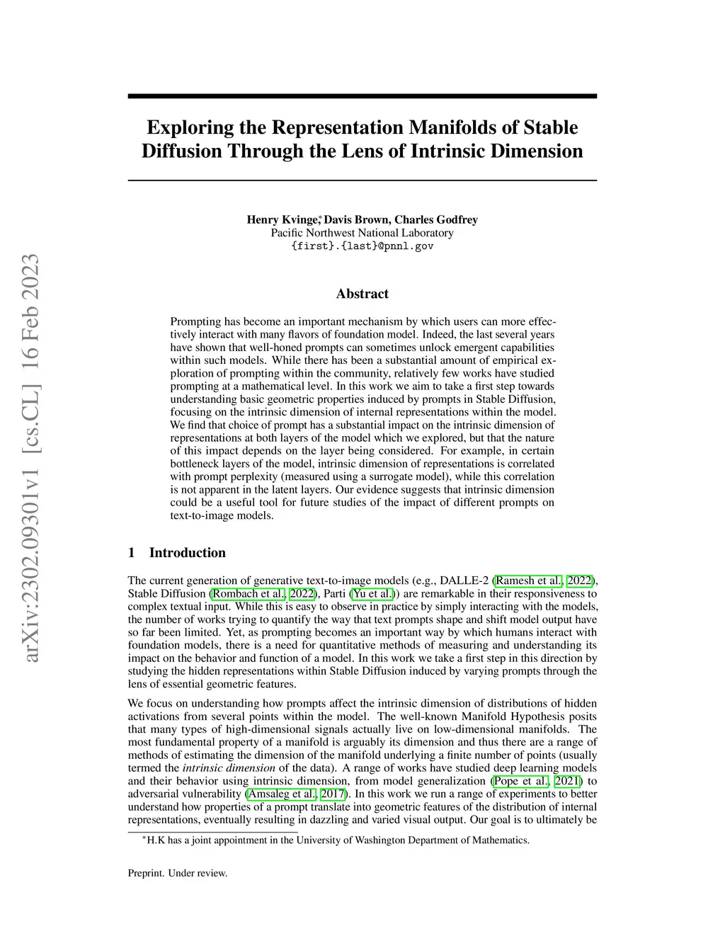 Prompting has become an important mechanism by which users can more effectively interact with many flavors of foundation model. Indeed, the last several years have shown that well-honed prompts can sometimes unlock emergent capabilities within such models. While there has been a substantial amount of empirical exploration of prompting within the community, relatively few works have studied prompting at a mathematical level. In this work we aim to take a first step towards understanding basic geometric properties induced by prompts in Stable Diffusion, focusing on the intrinsic dimension of internal representations within the model. We find that choice of prompt has a substantial impact on the intrinsic dimension of representations at both layers of the model which we explored, but that the nature of this impact depends on the layer being considered. For example, in certain bottleneck layers of the model, intrinsic dimension of representations is correlated with prompt perplexity (measured using a surrogate model), while this correlation is not apparent in the latent layers. Our evidence suggests that intrinsic dimension could be a useful tool for future studies of the impact of different prompts on text-to-image models.