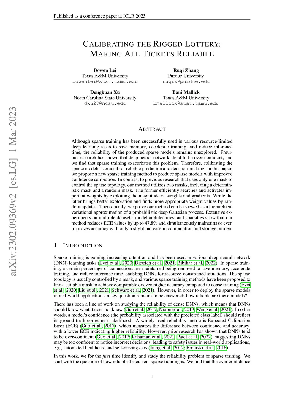 Although sparse training has been successfully used in various resource-limited deep learning tasks to save memory, accelerate training, and reduce inference time, the reliability of the produced sparse models remains unexplored. Previous research has shown that deep neural networks tend to be over-confident, and we find that sparse training exacerbates this problem. Therefore, calibrating the sparse models is crucial for reliable prediction and decision-making. In this paper, we propose a new sparse training method to produce sparse models with improved confidence calibration. In contrast to previous research that uses only one mask to control the sparse topology, our method utilizes two masks, including a deterministic mask and a random mask. The former efficiently searches and activates important weights by exploiting the magnitude of weights and gradients. While the latter brings better exploration and finds more appropriate weight values by random updates. Theoretically, we prove our method can be viewed as a hierarchical variational approximation of a probabilistic deep Gaussian process. Extensive experiments on multiple datasets, model architectures, and sparsities show that our method reduces ECE values by up to 47.8\% and simultaneously maintains or even improves accuracy with only a slight increase in computation and storage burden.