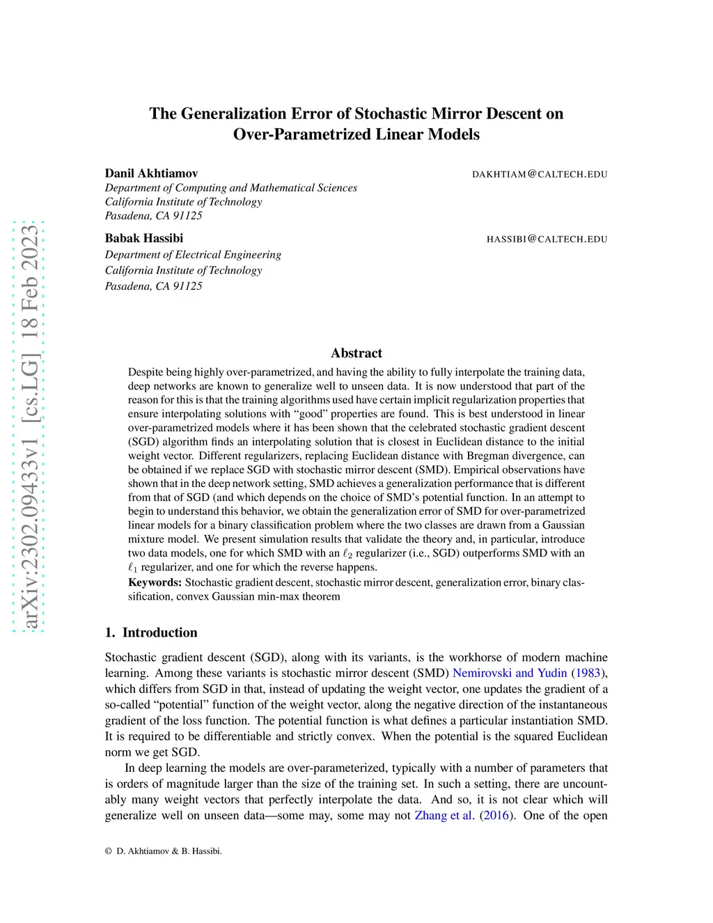 Despite being highly over-parametrized, and having the ability to fully interpolate the training data, deep networks are known to generalize well to unseen data. It is now understood that part of the reason for this is that the training algorithms used have certain implicit regularization properties that ensure interpolating solutions with "good" properties are found. This is best understood in linear over-parametrized models where it has been shown that the celebrated stochastic gradient descent (SGD) algorithm finds an interpolating solution that is closest in Euclidean distance to the initial weight vector. Different regularizers, replacing Euclidean distance with Bregman divergence, can be obtained if we replace SGD with stochastic mirror descent (SMD). Empirical observations have shown that in the deep network setting, SMD achieves a generalization performance that is different from that of SGD (and which depends on the choice of SMD's potential function. In an attempt to begin to understand this behavior, we obtain the generalization error of SMD for over-parametrized linear models for a binary classification problem where the two classes are drawn from a Gaussian mixture model. We present simulation results that validate the theory and, in particular, introduce two data models, one for which SMD with an regularizer (i.e., SGD) outperforms SMD with an regularizer, and one for which the reverse happens.