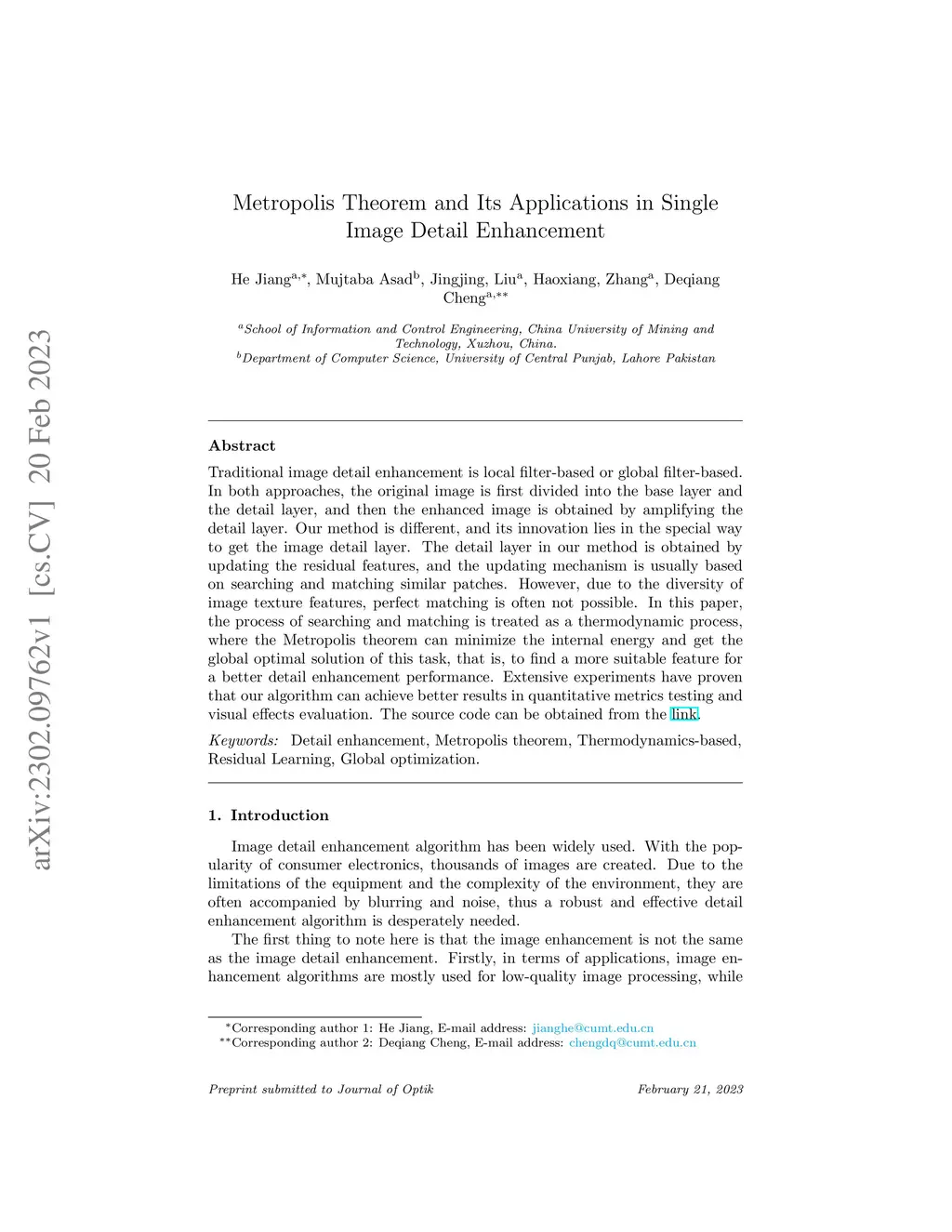 Traditional image detail enhancement is local filter-based or global filter-based. In both approaches, the original image is first divided into the base layer and the detail layer, and then the enhanced image is obtained by amplifying the detail layer. Our method is different, and its innovation lies in the special way to get the image detail layer. The detail layer in our method is obtained by updating the residual features, and the updating mechanism is usually based on searching and matching similar patches. However, due to the diversity of image texture features, perfect matching is often not possible. In this paper, the process of searching and matching is treated as a thermodynamic process, where the Metropolis theorem can minimize the internal energy and get the global optimal solution of this task, that is, to find a more suitable feature for a better detail enhancement performance. Extensive experiments have proven that our algorithm can achieve better results in quantitative metrics testing and visual effects evaluation. The source code can be obtained from the link.