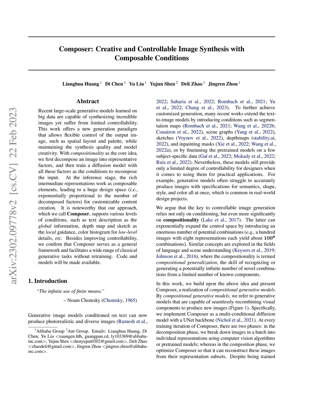 Recent large-scale generative models learned on big data are capable of synthesizing incredible images yet suffer from limited controllability. This work offers a new generation paradigm that allows flexible control of the output image, such as spatial layout and palette, while maintaining the synthesis quality and model creativity. With compositionality as the core idea, we first decompose an image into representative factors, and then train a diffusion model with all these factors as the conditions to recompose the input. At the inference stage, the rich intermediate representations work as composable elements, leading to a huge design space (i.e., exponentially proportional to the number of decomposed factors) for customizable content creation. It is noteworthy that our approach, which we call Composer, supports various levels of conditions, such as text description as the global information, depth map and sketch as the local guidance, color histogram for low-level details, etc. Besides improving controllability, we confirm that Composer serves as a general framework and facilitates a wide range of classical generative tasks without retraining. Code and models will be made available.