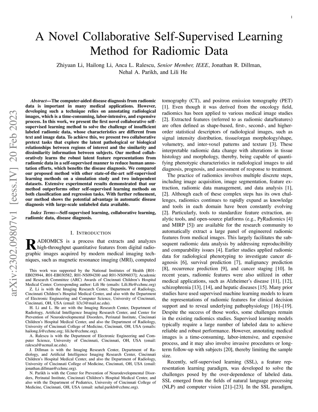 A Novel Collaborative Self-Supervised Learning Method for Radiomic Data