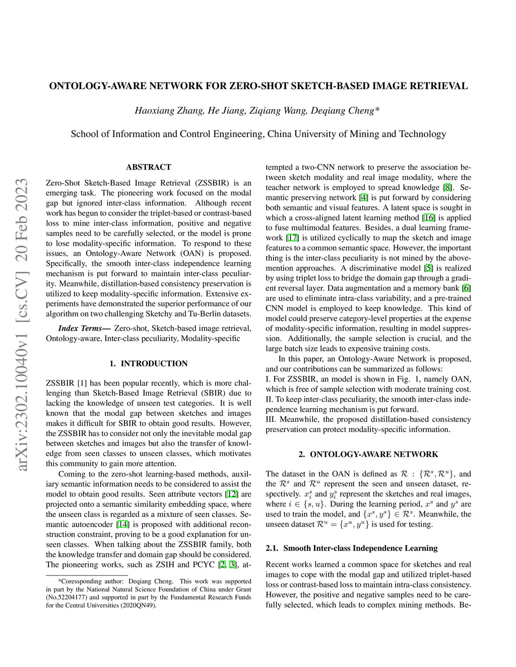 Zero-Shot Sketch-Based Image Retrieval (ZSSBIR) is an emerging task. The pioneering work focused on the modal gap but ignored inter-class information. Although recent work has begun to consider the triplet-based or contrast-based loss to mine inter-class information, positive and negative samples need to be carefully selected, or the model is prone to lose modality-specific information. To respond to these issues, an Ontology-Aware Network (OAN) is proposed. Specifically, the smooth inter-class independence learning mechanism is put forward to maintain inter-class peculiarity. Meanwhile, distillation-based consistency preservation is utilized to keep modality-specific information. Extensive experiments have demonstrated the superior performance of our algorithm on two challenging Sketchy and Tu-Berlin datasets.