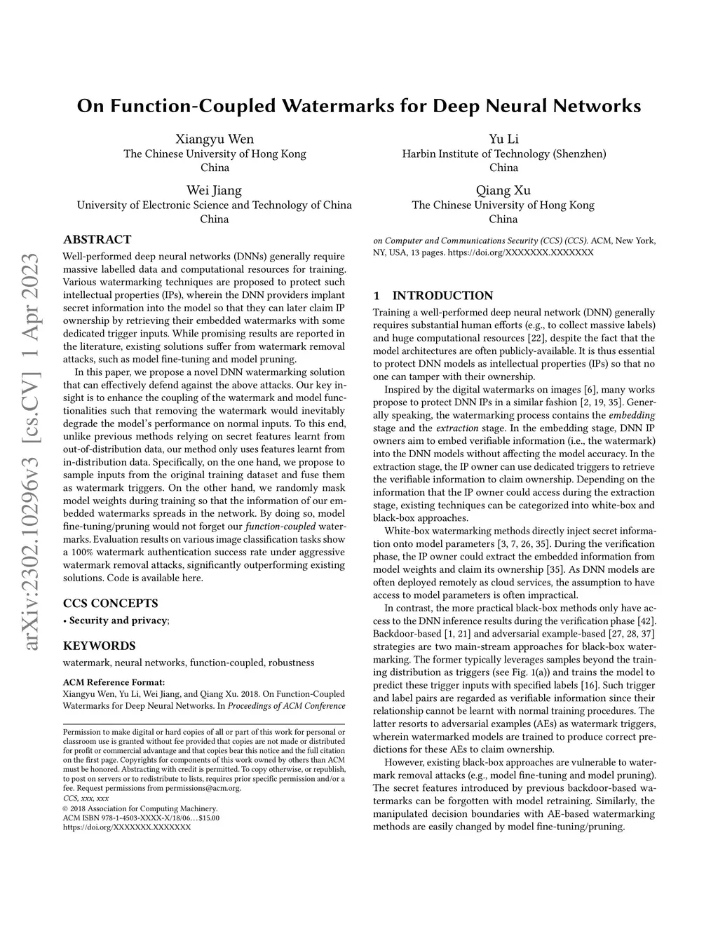 Well-performed deep neural networks (DNNs) generally require massive labelled data and computational resources for training. Various watermarking techniques are proposed to protect such intellectual properties (IPs), wherein the DNN providers implant secret information into the model so that they can later claim IP ownership by retrieving their embedded watermarks with some dedicated trigger inputs. While promising results are reported in the literature, existing solutions suffer from watermark removal attacks, such as model fine-tuning and model pruning. In this paper, we propose a novel DNN watermarking solution that can effectively defend against the above attacks. Our key insight is to enhance the coupling of the watermark and model functionalities such that removing the watermark would inevitably degrade the model's performance on normal inputs. To this end, unlike previous methods relying on secret features learnt from out-of-distribution data, our method only uses features learnt from in-distribution data. Specifically, on the one hand, we propose to sample inputs from the original training dataset and fuse them as watermark triggers. On the other hand, we randomly mask model weights during training so that the information of our embedded watermarks spreads in the network. By doing so, model fine-tuning/pruning would not forget our function-coupled watermarks. Evaluation results on various image classification tasks show a 100\% watermark authentication success rate under aggressive watermark removal attacks, significantly outperforming existing solutions. Code is available: https://github.com/cure-lab/Function-Coupled-Watermark.