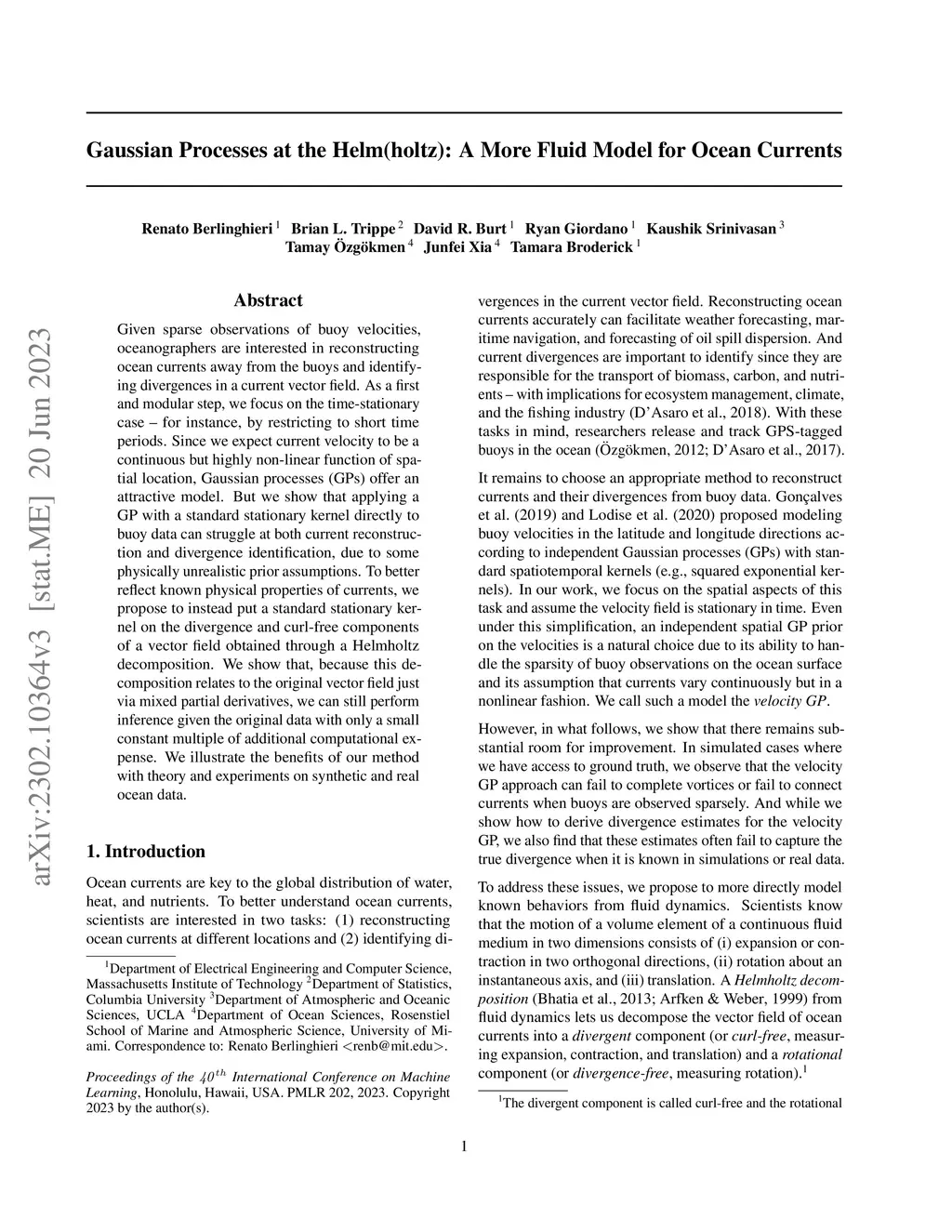 Given sparse observations of buoy velocities, oceanographers are interested in reconstructing ocean currents away from the buoys and identifying divergences in a current vector field. As a first and modular step, we focus on the time-stationary case - for instance, by restricting to short time periods. Since we expect current velocity to be a continuous but highly non-linear function of spatial location, Gaussian processes (GPs) offer an attractive model. But we show that applying a GP with a standard stationary kernel directly to buoy data can struggle at both current reconstruction and divergence identification, due to some physically unrealistic prior assumptions. To better reflect known physical properties of currents, we propose to instead put a standard stationary kernel on the divergence and curl-free components of a vector field obtained through a Helmholtz decomposition. We show that, because this decomposition relates to the original vector field just via mixed partial derivatives, we can still perform inference given the original data with only a small constant multiple of additional computational expense. We illustrate the benefits of our method with theory and experiments on synthetic and real ocean data.