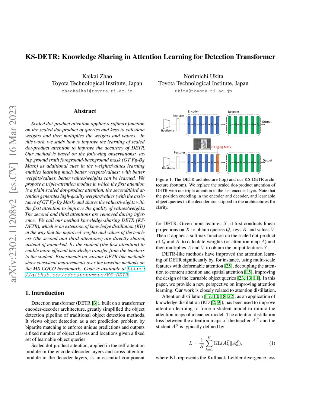 Scaled dot-product attention applies a softmax function on the scaled dot-product of queries and keys to calculate weights and then multiplies the weights and values. In this work, we study how to improve the learning of scaled dot-product attention to improve the accuracy of DETR. Our method is based on the following observations: using ground truth foreground-background mask (GT Fg-Bg Mask) as additional cues in the weights/values learning enables learning much better weights/values; with better weights/values, better values/weights can be learned. We propose a triple-attention module in which the first attention is a plain scaled dot-product attention, the second/third attention generates high-quality weights/values (with the assistance of GT Fg-Bg Mask) and shares the values/weights with the first attention to improve the quality of values/weights. The second and third attentions are removed during inference. We call our method knowledge-sharing DETR (KS-DETR), which is an extension of knowledge distillation (KD) in the way that the improved weights and values of the teachers (the second and third attentions) are directly shared, instead of mimicked, by the student (the first attention) to enable more efficient knowledge transfer from the teachers to the student. Experiments on various DETR-like methods show consistent improvements over the baseline methods on the MS COCO benchmark. Code is available at https://github.com/edocanonymous/KS-DETR.
