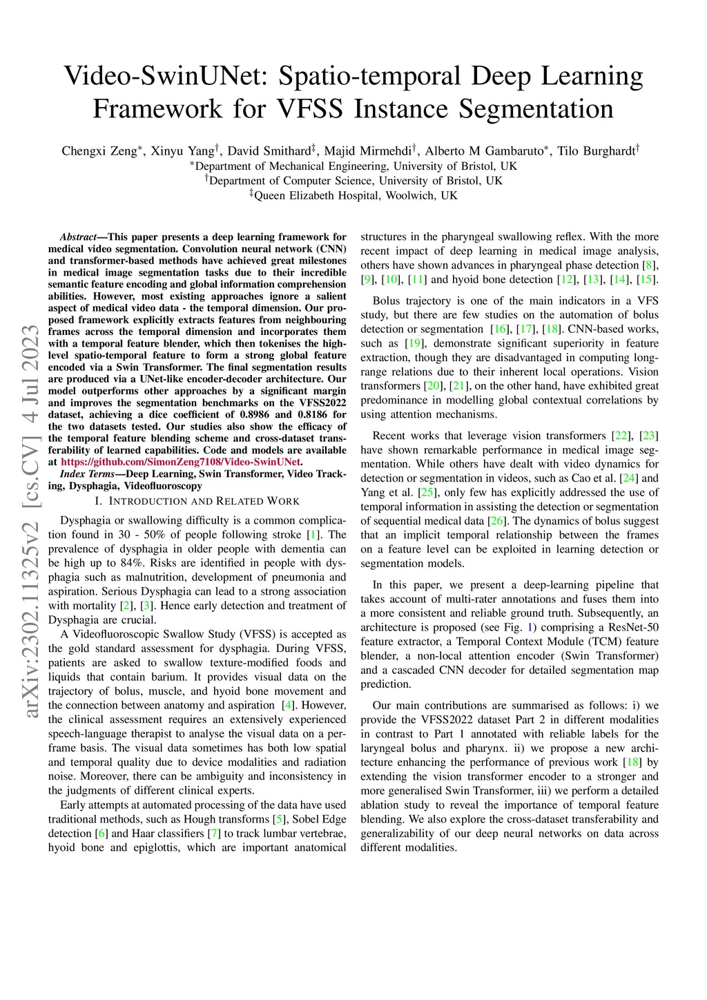 This paper presents a deep learning framework for medical video segmentation. Convolution neural network (CNN) and transformer-based methods have achieved great milestones in medical image segmentation tasks due to their incredible semantic feature encoding and global information comprehension abilities. However, most existing approaches ignore a salient aspect of medical video data - the temporal dimension. Our proposed framework explicitly extracts features from neighbouring frames across the temporal dimension and incorporates them with a temporal feature blender, which then tokenises the high-level spatio-temporal feature to form a strong global feature encoded via a Swin Transformer. The final segmentation results are produced via a UNet-like encoder-decoder architecture. Our model outperforms other approaches by a significant margin and improves the segmentation benchmarks on the VFSS2022 dataset, achieving a dice coefficient of 0.8986 and 0.8186 for the two datasets tested. Our studies also show the efficacy of the temporal feature blending scheme and cross-dataset transferability of learned capabilities. Code and models are fully available at https://github.com/SimonZeng7108/Video-SwinUNet.