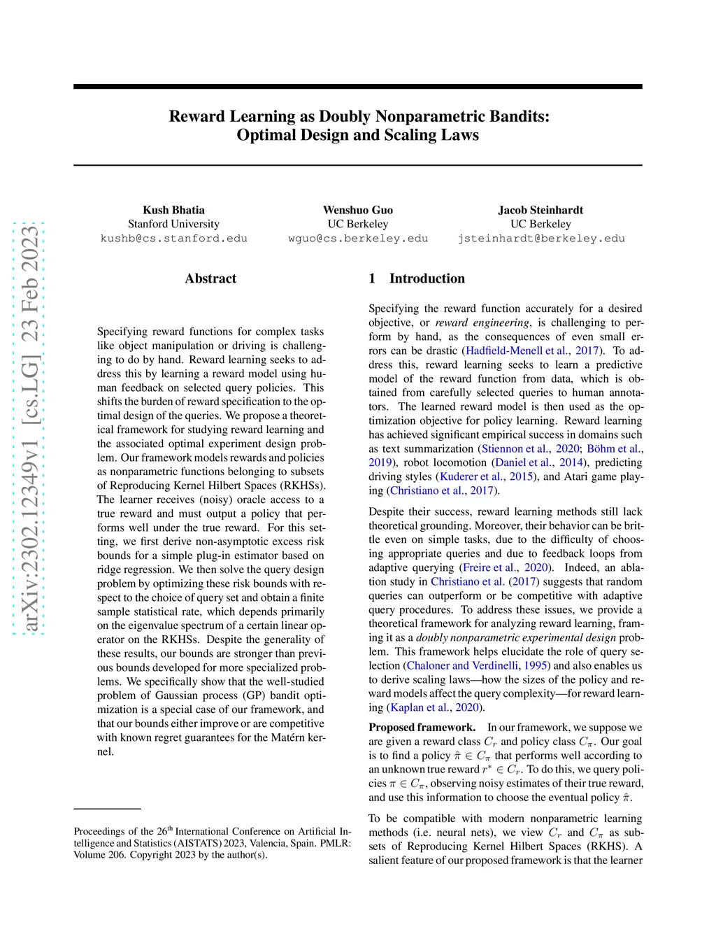 Reward Learning as Doubly Nonparametric Bandits: Optimal Design and