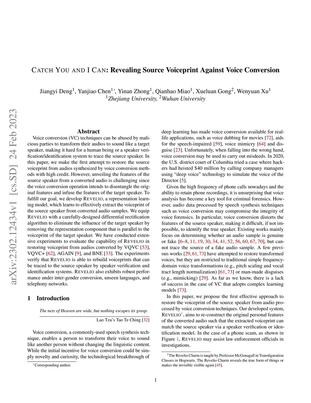 Voice conversion (VC) techniques can be abused by malicious parties to transform their audios to sound like a target speaker, making it hard for a human being or a speaker verification/identification system to trace the source speaker. In this paper, we make the first attempt to restore the source voiceprint from audios synthesized by voice conversion methods with high credit. However, unveiling the features of the source speaker from a converted audio is challenging since the voice conversion operation intends to disentangle the original features and infuse the features of the target speaker. To fulfill our goal, we develop Revelio, a representation learning model, which learns to effectively extract the voiceprint of the source speaker from converted audio samples. We equip Revelio with a carefully-designed differential rectification algorithm to eliminate the influence of the target speaker by removing the representation component that is parallel to the voiceprint of the target speaker. We have conducted extensive experiments to evaluate the capability of Revelio in restoring voiceprint from audios converted by VQVC, VQVC+, AGAIN, and BNE. The experiments verify that Revelio is able to rebuild voiceprints that can be traced to the source speaker by speaker verification and identification systems. Revelio also exhibits robust performance under inter-gender conversion, unseen languages, and telephony networks.