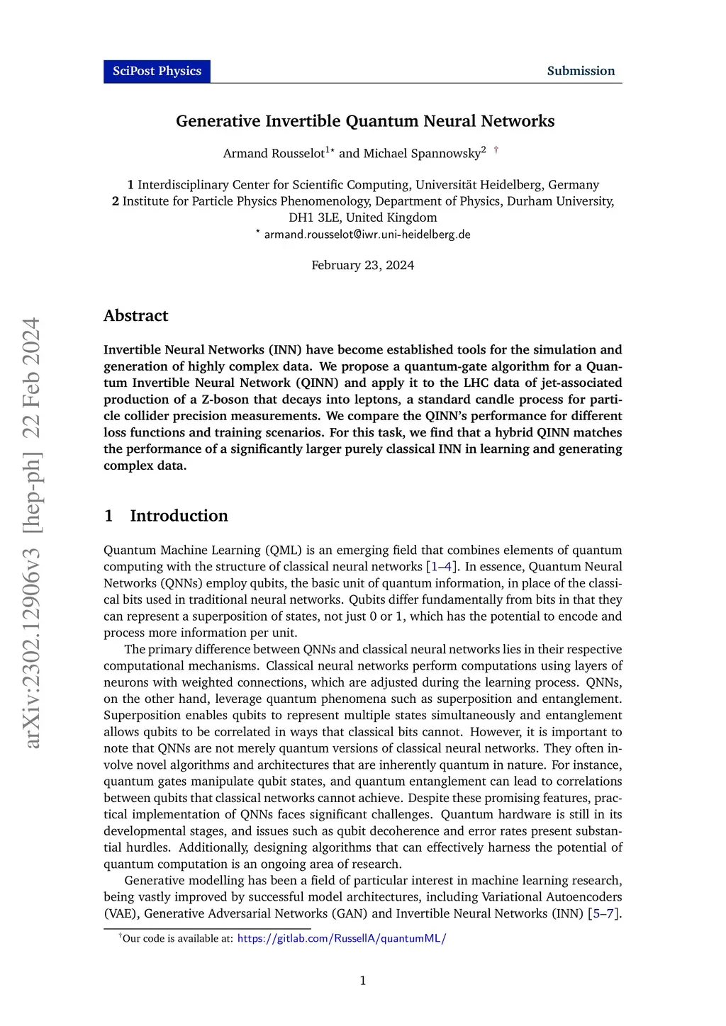 Invertible Neural Networks (INN) have become established tools for the simulation and generation of highly complex data. We propose a quantum-gate algorithm for a Quantum Invertible Neural Network (QINN) and apply it to the LHC data of jet-associated production of a Z-boson that decays into leptons, a standard candle process for particle collider precision measurements. We compare the QINN's performance for different loss functions and training scenarios. For this task, we find that a hybrid QINN matches the performance of a significantly larger purely classical INN in learning and generating complex data.